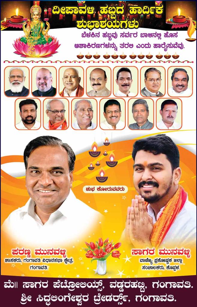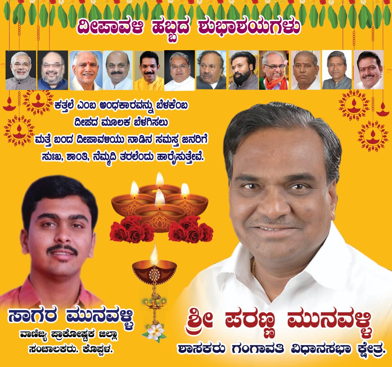 – ನಾಡಿನ ಸಮಸ್ತ ಜನರಿಗೆ ಗಂಗಾವತಿ ಶಾಸಕ ಶ್ರೀ ಪರಣ್ಣ ಮುನವಳ್ಳಿ ಹಾಗೂ ಕುಟುಂಬ ವರ್ಗದವರಿಂದ ದೀಪಾವಳಿ ಹಬ್ಬದ ಶುಭಾಶಯಗಳು..!