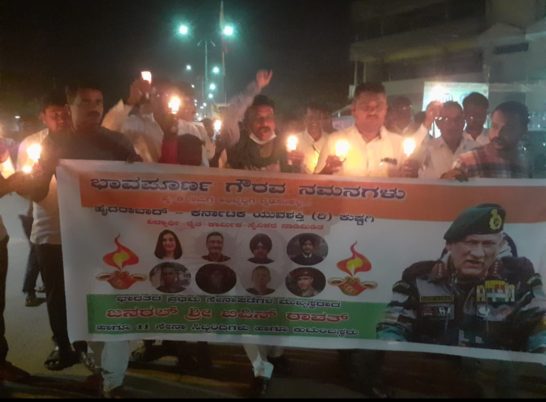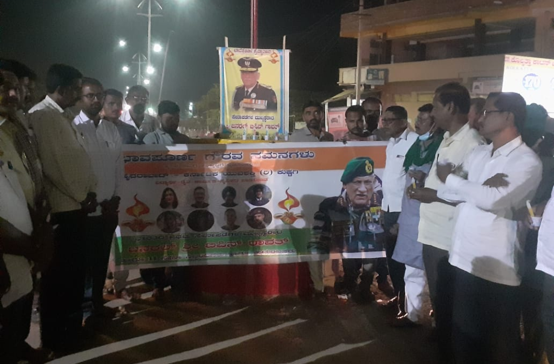 ಕುಷ್ಟಗಿ ಪಟ್ಟಣದ ಮಲ್ಲಯ್ಯ ವೃತ್ತದಲ್ಲಿ ಡಿ.10-12-2021 ರಂದು ಹೈ.ಕ. ಯುವಶಕ್ತಿ ಸಂಘಟನೆ ಕಾರ್ಯಕರ್ತರು ಹಾಗೂ ವಿವಿಧ ಸಂಘಟನೆಗಳ ಪದಾಧಿಕಾರಿಗಳು ಹುತಾತ್ಮರ ಗೌರವಾರ್ಥವಾಗಿ ಶ್ರದ್ಧಾಂಜಲಿ ಸಭೆ ಏರ್ಪಡಿಸಲಾಗಿತ್ತು. ಸಭೆಯಲ್ಲಿ ಭಾಗವಹಿಸಿದ್ದ ಪುರಸಭೆ ಅಧ್ಯಕ್ಷ ಗಂಗಾಧರ ಕೆ.ಹಿರೇಮಠ ಅವರು ಹುತಾತ್ಮ ಸೈನಿಕರ ಭಾವಚಿತ್ರಕ್ಕೆ ಪುಷ್ಪ ಸಮರ್ಪಿಸಿ ಗೌರವ ಸಲ್ಲಿಸಿದರು. ಬಳಿಕ ಮಾತನಾಡಿ, ಜನರಲ್ ಬಿಪಿನ್ ರಾವತ್ ಅವರು ಭಾರತದ ಮೂರು ಸೇನಾ ಪಡೆಯ ಅಧಿಕಾರಿಯಾಗಿದ್ದರು. ಅವರ ಸೇವಾ ದಕ್ಷತೆ ಅನುಕರಣೀಯ. ಭಯೋತ್ಪಾದನೆ ನಿಗ್ರಹಕ್ಕೆ ಕೈಗೊಂಡ ಸರ್ಜಿಕಲ್ ಸ್ಟ್ರೈಕ್ ಅಲ್ಲಿ ಅವರ ಪಾತ್ರ ಪ್ರಮುಖವಾಗಿದೆ ಎಂದು ನೆನಪು ಮೆಲುಕುಹಾಕಿದರು. ಹೈಕ ಯುವಶಕ್ತಿ ಸಂಸ್ಥಾಪಕ ಬಸವರಾಜ ಗಾಣಿಗೇರ್ ಮಾತನಾಡಿ, ದೇಶದ ಮೊದಲ ಸಿಡಿಎಸ್ ಅಧಿಕಾರಿಯಾಗಿದ್ದ ಜನರಲ್ ಬಿಪಿನ್ ಅವರು ಜನಮಾನಸರಾಗಿದ್ದರು. ತಮಿಳುನಾಡಿನಾ ಪೊಳೂರ್ ಸೇನಾ ಕಾಲೇಜಿಗೆ ಉಪನ್ಯಾಸ ನೀಡಲು ತೆರಳುವ ಸಂದರ್ಭದಲ್ಲಿ ಯಾರೂ ಉಹಿಸದ ಸೇನಾ ಹೆಲಿಕಾಪ್ಟರ್ ದುರಂತದಲ್ಲಿ ಅವರು ನಮ್ಮನ್ನಗಲಿದ್ದು, ಅತೀವ ನೋವು ತರಿಸಿದೆ. ಜತೆಗೆ ದೇಶಕ್ಕೆ ತುಂಬಲಾರದ ನಷ್ಟವಾಗಿದೆ ಎಂದು ಸಂತಾಪ ಸೂಚಿಸಿದರು.