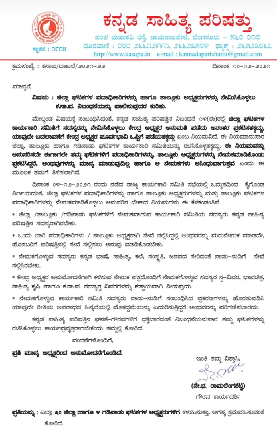 ಕನ್ನಡ ಸಾಹಿತ್ಯ ಪರಿಷತ್ತಿನ ನಿಬಂಧನೆ ೧೪ (ಈ) ರಲ್ಲಿ ಜಿಲ್ಲಾ ಘಟಕಗಳ ಕಾರ್ಯಕಾರಿ ಸಮಿತಿಗೆ ಸದಸ್ಯರನ್ನು ನೇಮಿಸಿಕೊಳ್ಳಲು ಕೇಂದ್ರ ಅಧ್ಯಕ್ಷರ ಅನುಮತಿ ಪಡೆದು, ನಂತರ ಪ್ರಕಟಿಸಬೇಕು, ಯಾವುದೇ ಬದಲಾವಣೆಗೆ ಕೇಂದ್ರ ಅಧ್ಯಕ್ಷರ ಪೂರ್ವಭಾವಿ ಒಪ್ಪಿಗೆ ಪಡೆಯಬೇಕು ಎಂಬ ನಿಯಮವಿದೆ. ಈ ನಿಯಮಾನುಸಾರ ಜಿಲ್ಲಾ, ತಾಲ್ಲೂಕು ಹಾಗೂ ಗಡಿನಾಡು ಘಟಕಗಳ ಕಾರ್ಯಕಾರಿ ಸಮಿತಿಗಳನ್ನು ರಚಿಸಿಕೊಳ್ಳಬೇಕು ಎಂಬ ಈ ನಿಯಮವನ್ನು ಅನುಸರಿಸದೇ ಈಗಾಗಲೇ ಘಟಕಗಳಿಗೆ ಪದಾಧಿಕಾರಿಗಳನ್ನು, ತಾಲ್ಲೂಕು ಅಧ್ಯಕ್ಷರುಗಳನ್ನು ನೇಮಕಮಾಡಿಕೊಂಡು ಪ್ರಕಟಿಸಿದ್ದರೆ… ಅಂತಹ ನೇಮಕಗಳನ್ನು ಮಾನ್ಯ ಮಾಡುವುದಿಲ್ಲ ಹಾಗೂ ಆ ನೇಮಕಗಳು ಅಸಿಂಧುವಾಗುತ್ತವೆ ಎಂದು 12-12-2021 ರಂದು ಹೊರಡಿಸಿರುವ ಆದೇಶದಲ್ಲಿ ಸ್ಪಷ್ಟಪಡಿಸಿದ್ದಾರೆ.