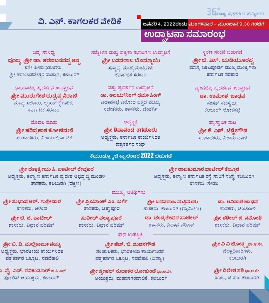 ಕರ್ನಾಟಕ ಕಾರ್ಯನಿರತ ಪತ್ರಕರ್ತರ ಸಂಘದ ರಾಜ್ಯಾಧ್ಯಕ್ಷ ಶಿವಾನಂದ ತಗಡೂರು ಅಧ್ಯಕ್ಷತೆಯಲ್ಲಿ ಜರಗುವ ಕಾರ್ಯಕ್ರಮದಲ್ಲಿ ಮಾಜಿ ಮುಖ್ಯಮಂತ್ರಿ ಬಿ.ಎಸ್.ಯಡಿಯೂರಪ್ಪ ಸ್ಮರಣ ಸಂಚಿಕೆ ಬಿಡುಗಡೆಗೊಳಿಸುವರು. ಶ್ರೀ ಶರಣಬಸವೇಶ್ವರ ಸಂಸ್ಥಾನ ಪೀಠಾಧಿಪತಿ ಡಾ.ಶರಣಬಸಪ್ಪ ಅಪ್ಪ ದಿವ್ಯ ಸಾನಿಧ್ಯವಹಿಸುವರು. ಸಮಾರೋಪ ಸಮಾರಂಭದಲ್ಲಿ ಮಾಜಿ ಪ್ರಧಾನಿ ಹೆಚ್.ಡಿ.ದೇವೇಗೌಡ ದಿಕ್ಸೂಚಿ ಭಾಷಣ ಮಾಡಲಿದ್ದಾರೆ. ರಾಜ್ಯಸಭೆಯ ವಿರೋಧ ಪಕ್ಷದ ನಾಯಕ ಮಲ್ಲಿಕಾರ್ಜುನ ಖರ್ಗೆ ಅಭಿನಂದನೆ ಆಶಯ ನುಡಿಗಳನ್ನು ನುಡಿಯಲಿದ್ದಾರೆ.