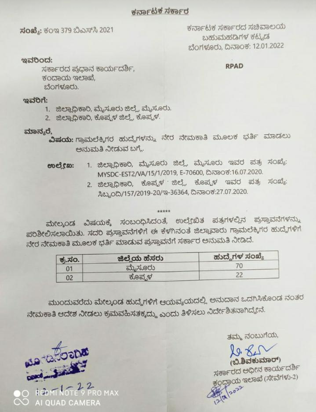 ಕೊಪ್ಪಳ ಜಿಲ್ಲೆಯಲ್ಲಿ 22 ಮೈಸೂರು ಜಿಲ್ಲೆಯಲ್ಲಿ 70 ಗ್ರಾಮ ಲೆಕ್ಕಿಗರ (Village Account tent) ಹುದ್ದೆಗಳಿಗೆ ನೇರ ನೇಮಕಗೊಳಿಸಲು ಕಂದಾಯ ಇಲಾಖೆಯ ಸರಕಾರದ ಅಧೀನ ಕಾರ್ಯದರ್ಶಿ ಬಿ.ಶಿವಕುಮಾರ ಜಿಲ್ಲಾಧಿಕಾರಿಗಳಿಗೆ ಹೊರಡಿಸಿದ ಪತ್ರದಲ್ಲಿ ಸ್ಪಷ್ಟಪಡಿಸಿದ್ದಾರೆ..!!