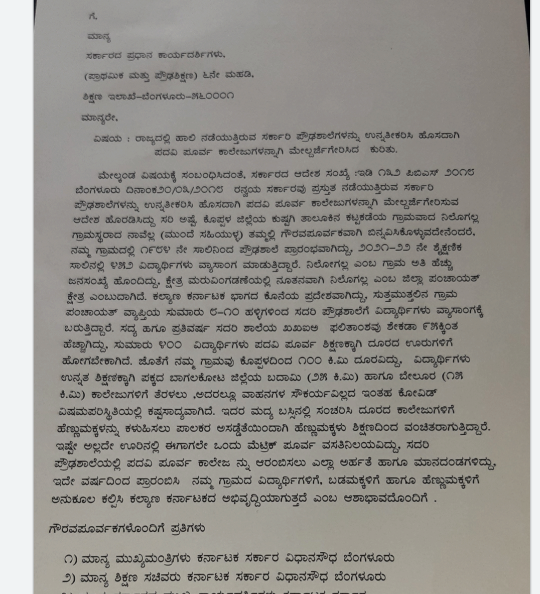 16-01-2022 ರಂದು ಬೆಳಗ್ಗೆ ನಿಲೋಗಲ್ ಗ್ರಾಮದಲ್ಲಿ ಸಭೆ ಸೇರಿದ ಗ್ರಾಮಸ್ಥರು ಪದವಿ ಪೂರ್ವ ಕಾಲೇಜು ಸ್ಥಾಪನೆಗೆ ಒಕ್ಕೊರಲಿನಿಂದ ದ್ವನಿಗೂಡಿಸುವ ಮೂಲಕ ಬೆಂಬಲ ವ್ಯಕ್ತಪಡಿಸಿದರು. 1984 ರಲ್ಲಿಯೇ ನಿಲೋಗಲ್ ಗ್ರಾಮದಲ್ಲಿ ಸರಕಾರಿ ಪ್ರೌಢ ಶಾಲೆ ಸ್ಥಾಪನೆಯಾಗಿದೆ. ಶಾಲೆಯಲ್ಲಿ 452 ವಿದ್ಯಾರ್ಥಿಗಳು ಈಗಾಗಲೇ ಅಭ್ಯಾಸಮಾಡುತ್ತಿದ್ದು, ಮುಂದಿನ ವಿದ್ಯಾಭ್ಯಾಸಕ್ಕಾಗಿ ದೂರದ ಬಾಗಲಕೋಟೆ ಜಿಲ್ಲೆಯ ಬಾದಾಮಿ, ಗದಗ, ರೋಣ, ಇಲಕಲ್, ಬೇಲೂರು ಹಾಗೂ ಗಜೇಂದ್ರಗಡದಂತಹ ಪಟ್ಟಣಗಳಿಗೆ ಅಲೆದಾಟ ಈ ಭಾಗದ ವಿದ್ಯಾರ್ಥಿಗಳಿಗೆ ಅನಿವಾರ್ಯವಾಗಿದೆ. ನಿಲೋಗಲ್ ಗ್ರಾಮ ಹೈದ್ರಾಬಾದ್ ಕರ್ನಾಟಕ ಪ್ರದೇಶದ ಅತ್ಯಂತ ಹಿಂದುಳಿದ ತಾಲೂಕು ಕೇಂದ್ರ ಕುಷ್ಟಗಿಯಿಂದ ಸುಮಾರು 50 ಕಿ.ಮೀ ದೂರದಲ್ಲಿದೆ. ಜಿಲ್ಲೆ ಹಾಗೂ ಗುಲಬರ್ಗಾ ವಿಭಾಗದ ಗಡಿ ಗ್ರಾಮವಾದ ನಿಲೋಗಲದಲ್ಲಿ ಸರಕಾರಿ ಪ್ರೌಢ ಶಾಲೆ ಸ್ಥಾಪಿಸಬೇಕೆಂದು ಸಭೆಯಲ್ಲಿ ಸರಕಾರವನ್ನು ಒತ್ತಾಯಪಡಿಸುವುದಲ್ಲದೆ, ಸರಕಾರದ ಮುಖ್ಯ ಕಾರ್ಯದರ್ಶಿಗಳಿಗೆ ಪತ್ರ ಬರೆಯುವ ಮೂಲಕ ಸಭೆಯಲ್ಲಿ ಗ್ರಾಮಸ್ಥರು ಒತ್ತಾಯಿಸಿದ್ದಾರೆ.