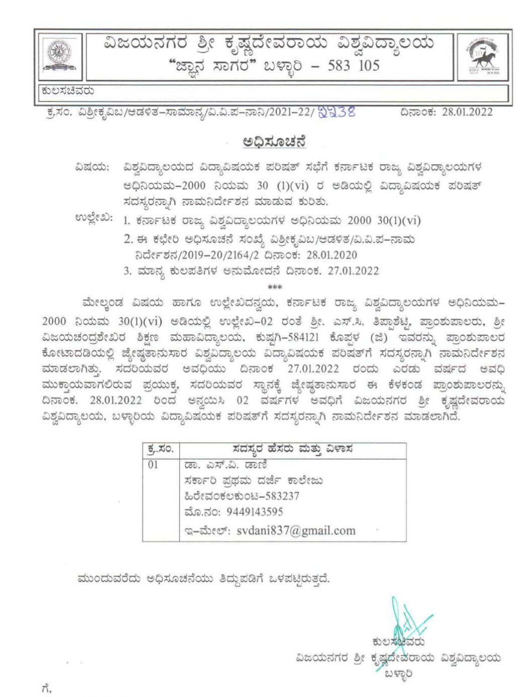 ಈ ಕುರಿತು ಕರ್ನಾಟಕ ರಾಜ್ಯ ವಿಶ್ವವಿದ್ಯಾಲಯಗಳ ಅಧಿನಿಯಮ 2000 ನಿಯಮ 30 (1) (vi) ಅಡಿಯಲ್ಲಿ ಪ್ರಾಂಶುಪಾಲರ ಕೋಟಾದಡಿಯಲ್ಲಿ ವಿಶ್ವವಿದ್ಯಾಲಯ ವಿದ್ಯಾವಿಷಯಕ ಪರಿಷತ್ಗೆ ಅನ್ವಯಿಸಿ 02 ವರ್ಷಗಳ ಅವಧಿಗೆ ಡಾ.ಶರಣಬಸವೇಶ್ವರ ವಿ.ಡಾಣಿ ಅವರನ್ನು ವಿದ್ಯಾವಿಷಯಕ ಪರಿಷತ್ ಸದಸ್ಯರನ್ನಾಗಿ ನಾಮನಿರ್ದೇಶನ ಮಾಡಲಾಗಿದೆ ಎಂದು ಬಳ್ಳಾರಿಯ ವಿಜಯನಗರ ಶ್ರೀಕೃಷ್ಣದೇವರಾಯ ವಿಶ್ವವಿದ್ಯಾಲಯ ಕುಲಪತಿಗಳು ಆದೇಶದಲ್ಲಿ ತಿಳಿಸಿದ್ದಾರೆ. ಈ ಭಾಗದ ಚುನಾಯಿತ ಪ್ರತಿನಿಧಿಗಳು ಸೇರಿದಂತೆ ಸಾಹಿತಿಗಳು, ಅಪಾರ ಶಿಷ್ಯ ಬಳಗ ಅಭಿನಂದಿಸಿದೆ..!!