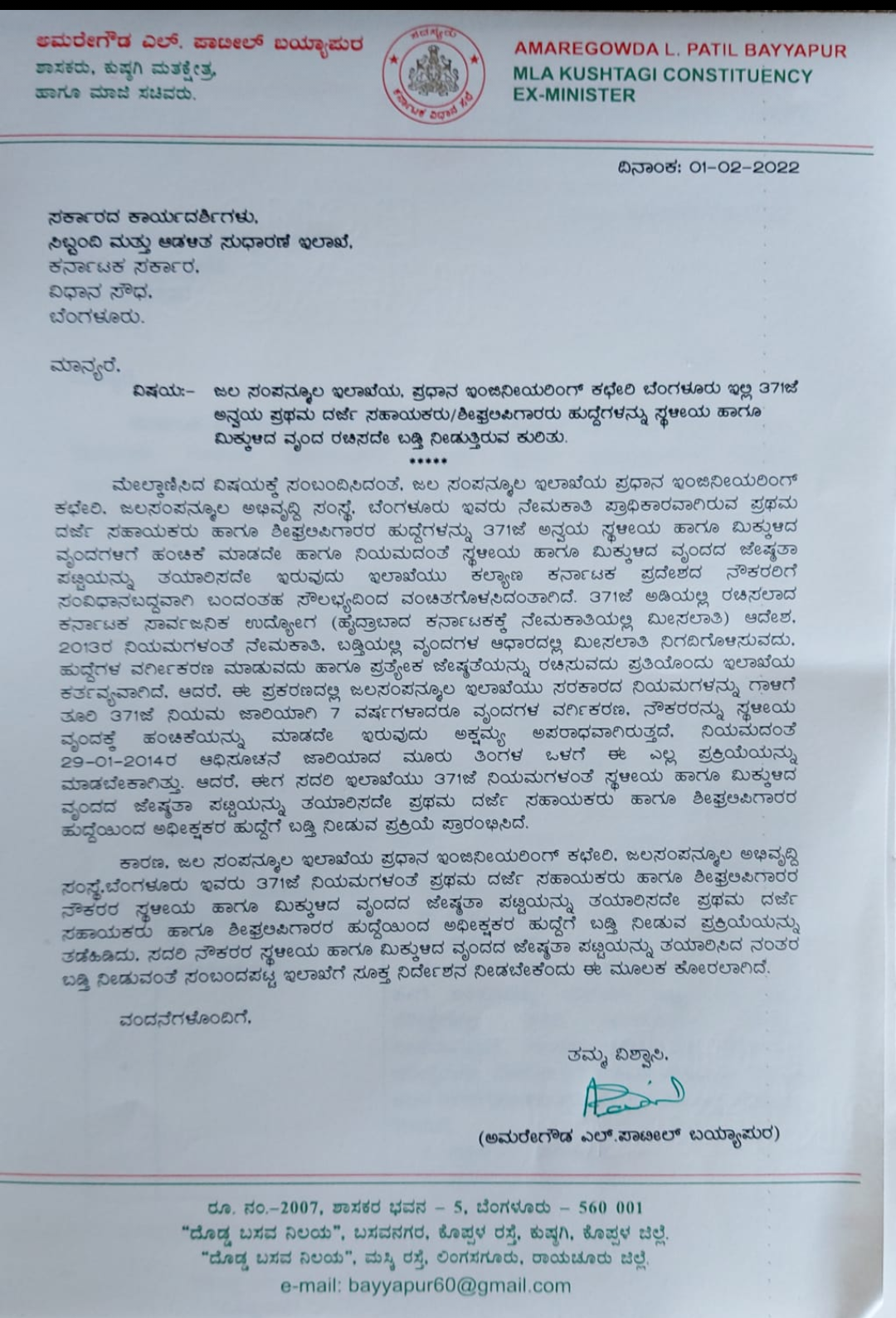 ಶಾಸಕರು ಕಾರ್ಯದರ್ಶಿಗಳಿಗೆ ಬರೆದ ಪತ್ರದಲ್ಲಿ ತಿಳಿಸಿದ್ದಿಷ್ಟು, ಜಲಸಂಪನ್ಮೂಲ ಇಲಾಖೆಯ ಪ್ರಥಮ ದರ್ಜೆ ಸಹಾಯಕರು ಹಾಗೂ ಶೀಘ್ರಲಿಪಿಗಾರರ ಹುದ್ದೆಗಳನ್ನು 371ಜೆ ಅನ್ವಯ ಸ್ಥಳೀಯ ಹಾಗೂ ಮಿಕ್ಕುಳಿದ ವೃಂದಗಳಿಗೆ ಹಂಚಿಕೆ ಮಾಡದೇ ಹಾಗೂ ನಿಯಮದಂತೆ ಸ್ಥಳೀಯ ಹಾಗೂ ಮಿಕ್ಕುಳದ ವೃಂದದ ಜೇಷ್ಠತಾ ಪಟ್ಟಿಯನ್ನು ತಯಾರಿಸದೇ ಇರುವುದು ಕೆ.ಕೆ. ಭಾಗದ ನೌಕರರಿಗೆ ಸಂವಿಧಾನ ಬದ್ಧವಾಗಿರುವ ಸೌಲಭ್ಯದಿಂದ ವಂಚಿತಗೊಳಸಿದಂತಾಗಿದೆ ಎಂದು ತಿಳಿಸಿದ್ದಾರೆ.