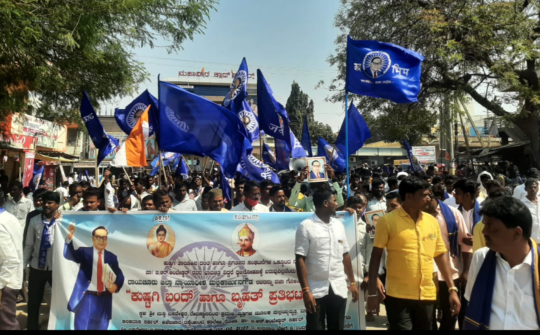 ಮೆರವಣಿಗೆ : ಮದ್ಯಾಹ್ನ ನಗರದ ಬುತ್ತಿ ಬಸವೇಶ್ವರ ದೇವಸ್ಥಾನದ ಆವರಣದಲ್ಲಿ ಸಮಾವೇಶಗೊಂಡ ವಿವಿಧ ದಲಿತ ಮತ್ತು ಪ್ರಗತಿಪರ ಹಾಗೂ ರೈತ ಸಂಘಟನೆಯ ಕಾರ್ಯಕರ್ತರು ರಸ್ತೆಗೆ ಇಳಿದು ಬೃಹತ್ ಪ್ರತಿಭಟನಾ ಮೆರವಣಿಗೆ ನಡೆಸಿದರು. ಮಾರುತಿ ವೃತ್ತದ ಮಾರ್ಗವಾಗಿ ಪ್ರಮುಖ ಬೀದಿಗಳಲ್ಲಿ ಸಂಚರಿಸಿದ ಪ್ರತಿಭಟನಾಕಾರರು ಡಾ.ಬಿ.ಆರ್.ಅಂಬೇಡ್ಕರ್ ಅವರ ಭಾವಚಿತ್ರ ಇರುವ ಭಾವುಟ ಹಿಡಿದು ರಾಯಚೂರು ಜಿಲ್ಲಾ ನ್ಯಾಯಾಧೀಶನ ವಿರುದ್ಧ ಘೋಷಣೆಗಳನ್ನು ಕೂಗುವ ಮೂಲಕ ಆಕ್ರೋಶ ವ್ಯಕ್ತಪಡಿಸಿದರು.