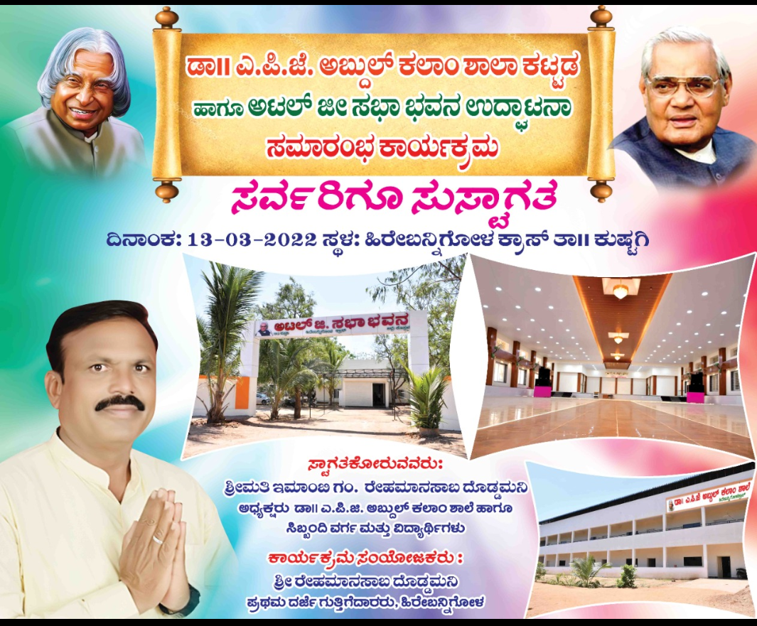 ನೂತನವಾಗಿ ನಿರ್ಮಿಸಿದ ಅಟಲ್ ಜೀ ಸಭಾ ಭವನದಲ್ಲಿ ಕರೆಯಲಾಗಿದ್ದ ಪತ್ರಿಕಾಗೋಷ್ಠಿಯಲ್ಲಿ ಅವರು ಸ್ಪಷ್ಟಪಡಿಸಿದರು. ನೂತನ ಶಾಲಾ ಕಟ್ಟಡವನ್ನು ಜಿಲ್ಲಾ ಉಸ್ತುವಾರಿ ಸಚಿವ ಹಾಲಪ್ಪ ಆಚಾರ ಉದ್ಘಾಟಿಸುವರು. ಕಾರ್ಯಕ್ರಮದ ಉದ್ಘಾಟನೆಯನ್ನು ಸಂಸದ ಸಂಗಣ್ಣ ಕರಡಿ ಉದ್ಘಾಟಿಸುವರು. ಶಾಸಕ ಅಮರೇಗೌಡ ಪಾಟೀಲ ಬಯ್ಯಾಪೂರು ಅಧ್ಯಕ್ಷತೆಯಲ್ಲಿ ಜರಗುವ ಕಾರ್ಯಕ್ರಮದಲ್ಲಿ ಕುಷ್ಟಗಿಯ ಕರಿಬಸವ ಶಿವಾಚಾರ್ಯ ಮಹಾಸ್ವಾಮಿಗಳು, ನಿಡಶೇಸಿಯ ಚನ್ನಬಸವ ಶಿವಾಚಾರ್ಯ ಮಹಾಸ್ವಾಮಿಗಳು, ಚಳಗೇರಿಯ ವೀರಸಂಗಮೇಶ್ವರ ಶಿವಾಚಾರ್ಯ ಮಹಾಸ್ವಾಮಿಗಳು, ಯಲಬುರ್ಗಾದ ಸಿದ್ಧರಾಮೇಶ್ವರ ಶಿವಾಚಾರ್ಯ ಮಹಾಸ್ವಾಮಿಗಳು, ಎಂ.ಗುಡದೂರು ನೀಲಕಂಠಯ್ಯ ತಾತನವರು, ಇಲಕಲ್ ಹಜರತ್ ಸೈಯದ್ ಶಾ ಅಬ್ದುಲ್ ಖಾದ್ರಿ ದಿವ್ಯ ಸಾನಿಧ್ಯವಹಿಸುವರು. ಶಾಸಕರಾದ ಕಳಕಪ್ಪ ಬಂಡಿ (ರೋಣ), ರಾಘವೇಂದ್ರ ಹಿಟ್ನಾಳ, ಮಾಜಿ ಶಾಸಕರಾದ ದೊಡ್ಡನಗೌಡ ಪಾಟೀಲ, ಕೆ.ಶರಣಪ್ಪ , ಹಸನಸಾಬ್ ದೋಟಿಹಾಳ, ಹಿರೇಬನ್ನಿಗೋಳ ಗ್ರಾಮ ಪಂಚಾಯಿತಿ ಅಧ್ಯಕ್ಷೆ ಲಕ್ಷ್ಮಿಬಾಯಿ ಹೊನ್ನಪ್ಪ ಅಳ್ಳಳ್ಳಿ, ತಹಸೀಲ್ದಾರ ಎಂ.ಸಿದ್ಧೇಶ, ಕೊಪ್ಪಳ ಜಿಪಂ ಯೋಜನಾಧಿಕಾರಿ ಟಿ.ಕೃಷ್ಣಮೂರ್ತಿ, ಕುಷ್ಟಗಿ ತಾಪಂ ಇಓ ಡಾ.ಜಯರಾಮ ಚವ್ಹಾಣ, ಬಿಇಓ ಚನ್ನಬಸಪ್ಪ ಮಗ್ಗದ, ಸಿಪಿಐ ನಿಂಗಪ್ಪ ಎನ್ ಆರ್ ಸೇರಿದಂತೆ ಇನ್ನಿತರರು ಭಾಗವಹಿಸುವರು. ಸುದ್ದಿಗೋಷ್ಠಿಯಲ್ಲಿ ಡಾ.ಎಪಿಜೆ ಅಬ್ದುಲ್ ಕಲಾಂ ಶಾಲೆಯ ಅಧ್ಯಕ್ಷೆ ಇಮಾಂಬಿ ರೇಹಮಾನಸಾಬ ದೊಡ್ಡಮನಿ, ಅಲ್ಲಾಸಾಬ್, ಹುಸೇನಬಿ, ಅಲ್ಲಾಬೀ, ಮಹಮ್ಮದ್ ಹುಸೇನ್ ಪಾಷಾ, ಸೈಫುಲ್ಲಾ, ಸಮ್ರೀನ್, ಸಾನಿಯಾ ಸೇರಿದಂತೆ ಇನ್ನಿತರರು ಉಪಸ್ಥಿತರಿದ್ದರು.