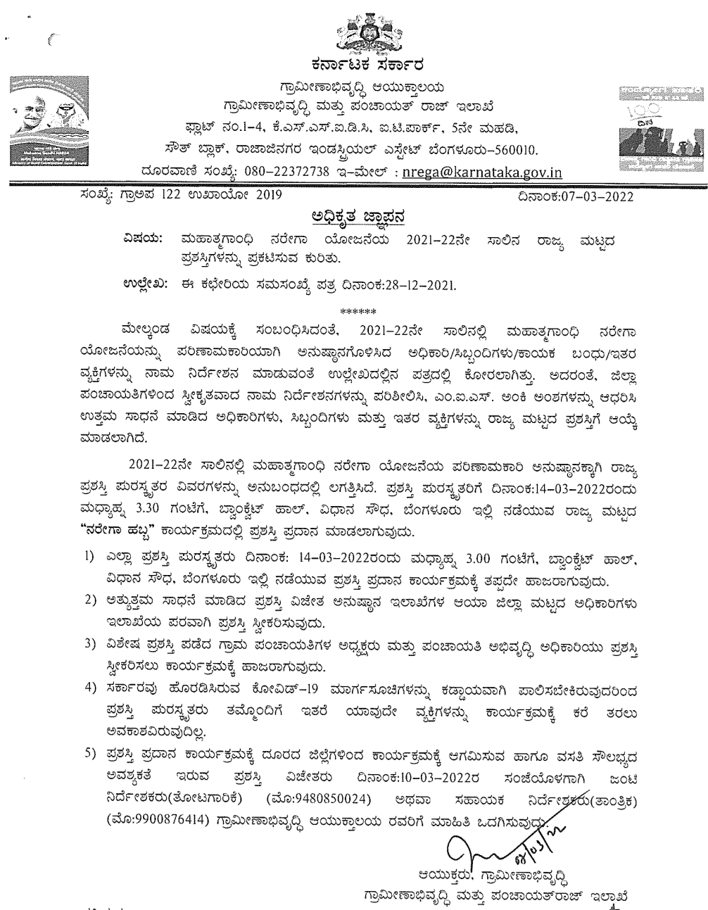 ನರೇಗಾ ಯೋಜನೆಯಲ್ಲಿನ ಎಂಐಎಸ್ ಅಂಕಿ ಅಂಶಗಳನ್ನು ಪರಿಶೀಲಿಸಿ ಉತ್ತಮ ಸಾಧನೆ ಮಾಡಿದ ಜಿಪಂ, ತಾಪಂ ಹಾಗೂ ಗ್ರಾಪಂ ಅಧಿಕಾರಿಗಳು ಮತ್ತು ಸಿಬ್ಬಂದಿವರ್ಗಗಳಿಗೆ ರಾಜ್ಯಮಟ್ಟದ ಪ್ರಶಸ್ತಿಗೆ ಆಯ್ಕೆಮಾಡಲಾಗಿದೆ ಎಂದು ಗ್ರಾಮೀಣಾಭಿವೃದ್ಧಿ ಮತ್ತು ಪಂಚಾಯತ್ ರಾಜ್ಯ ಇಲಾಖೆ ಆಯುಕ್ತರು ಹೊರಡಿಸಿದ ಆದೇಶದಲ್ಲಿ ತಿಳಿಸಿದ್ದಾರೆ. 14-03-2022 ರಂದು ವಿಧಾನ ಸೌಧದ ಬ್ಯಾಂಕ್ವಟ್ ಹಾಲ್ ನಲ್ಲಿ ರಾಜ್ಯಮಟ್ಟದ ಪ್ರಶಸ್ತಿ ನೀಡಿ, ಸತ್ಕರಿಸಿ ಸನ್ಮಾನಿಸಲಾಗುವುದು. ಪ್ರಶಸ್ತಿಗೆ ಆಯ್ಕೆಯಾದ ಏಳು ಜನ ಮಹನೀಯರಿಗೆ ಜಿಪಂ ಸಿಇಓ ಬಿ.ಪೌಜಿಯಾ ತರುನ್ನಮ್ ಸೇರಿದಂತೆ ಹಿರಿಯ ಅಧಿಕಾರಿಗಳು, ಎಲ್ಲಾ ತಾಪಂ ಕಾರ್ಯನಿರ್ವಾಹಕ ಅಧಿಕಾರಿಗಳು ಅಭಿನಂದಿಸಿದ್ದಾರೆ..!!
