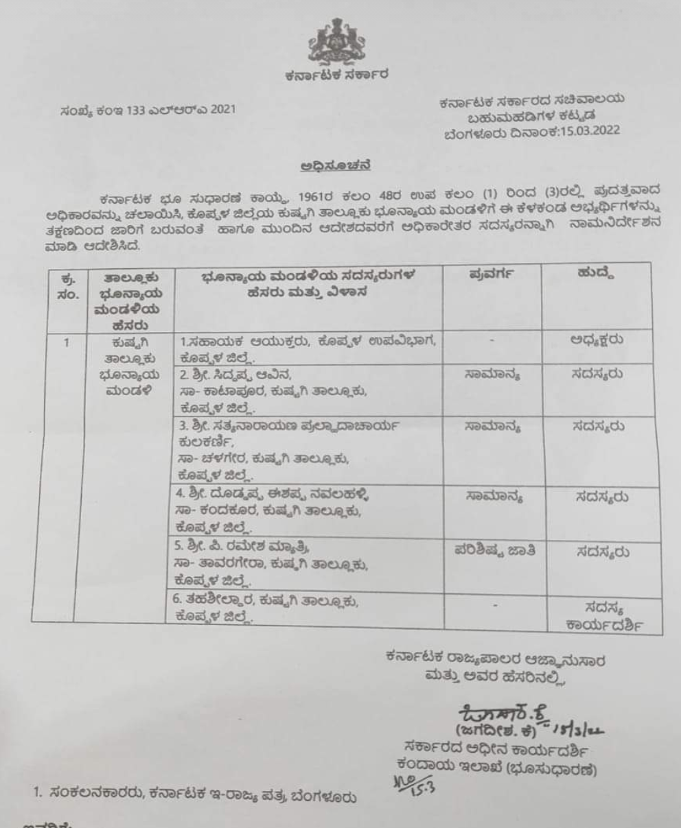 ಕುಷ್ಟಗಿ ತಾಲೂಕಿನ ಕಾಟಾಪೂರ ಗ್ರಾಮದ ತಾಲೂಕಾ ಪಂಚಾಯಿತಿ ಮಾಜಿ ಉಪಾಧ್ಯಕ್ಷ ಸಿದ್ದಪ್ಪ ಆವಿನ, ಚಳಗೇರಾ ಗ್ರಾಮದ ಸತ್ಯಾನಾರಾಯಣ ಪ್ರಲ್ಹಾದಾಚಾರ್ಯ ಕುಲಕರ್ಣಿ, ಕಂದಕೂರು ಗ್ರಾಮದ ದೊಡ್ಡಪ್ಪ ಈಶಪ್ಪ ನವಲಹಳ್ಳಿ ಹಾಗೂ ತಾವರಗೇರಾದ ನ್ಯಾಯವಾದಿ ಪಿ.ರಮೇಶ ಮ್ಯಾತ್ರಿ ಅವರನ್ನು ಕಂದಾಯ ಇಲಾಖೆಯ ಸರಕಾರದ ಅಧೀನ ಕಾರ್ಯದರ್ಶಿ ಜಗದೀಶ್. ಕೆ ಅವರು ಕರ್ನಾಟಕ ಭೂ ಸುಧಾರಣಾ ಕಾಯ್ದೆ 1961 ಕಲಂ 48 ಉಪ ಕಲಂ (1) ರಿಂದ (3) ರ ಪ್ರದತ್ತವಾದ ಅಧಿಕಾರವನ್ನು ಚಲಾಯಿಸಿ ನಾಮನಿರ್ದೇಶನಗೊಳಿಸಿದ್ದಾಗಿ ಆದೇಶದಲ್ಲಿ ಸ್ಪಷ್ಟಪಡಿಸಿದ್ದಾರೆ..!!