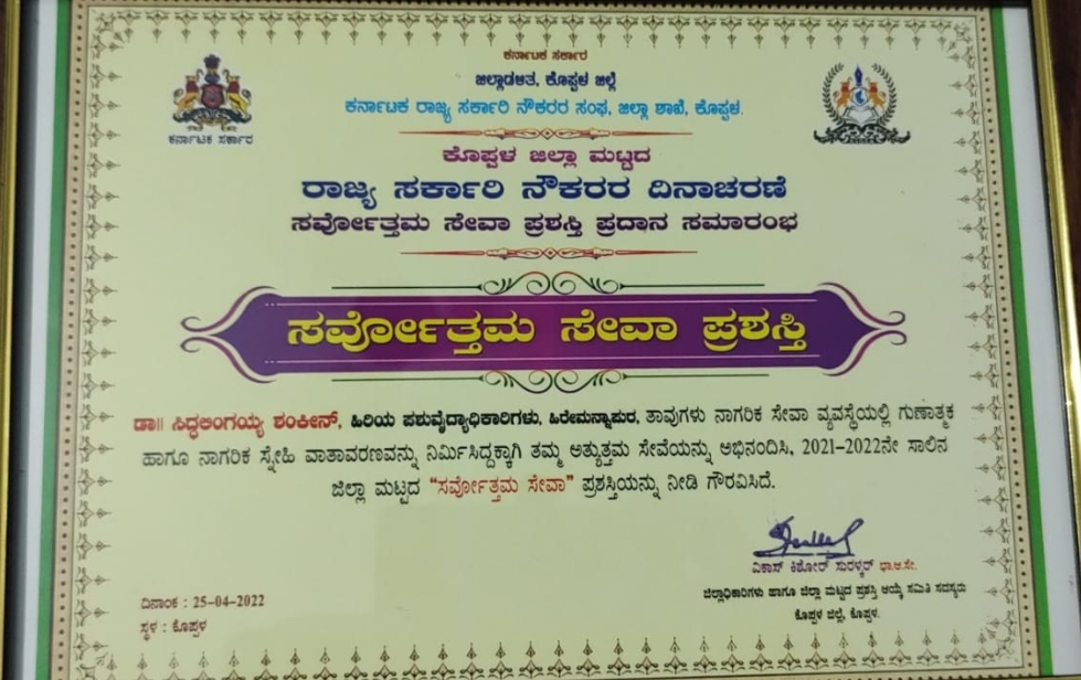 ದಿನಾಂಕ 25 – 04- 2022 ರಂದು ಜಿಲ್ಲಾಡಳಿತ ಭವನದ ಆಡಿಟೋರಿಯಂನಲ್ಲಿ ನಡೆದ ಕರ್ನಾಟಕ ರಾಜ್ಯ ಸರ್ಕಾರಿ ನೌಕರರ ದಿನಾಚರಣೆಯ ಹಾಗೂ ಸರ್ವೋತ್ತಮ ಸೇವಾ ಪ್ರಶಸ್ತಿ ಪ್ರದಾನ ಸಮಾರಂಭದಲ್ಲಿ ಡಾ.ಸಿದ್ಧಲಿಂಗಯ್ಯ ಸೇರಿದಂತೆ ಜಿಲ್ಲೆಯ ಹತ್ತುಜನ ನೌಕರರಿಗೆ ಜಿಲ್ಲಾಧಿಕಾರಿಗಳು ಪ್ರಶಸ್ತಿ ಪ್ರದಾನ ಮಾಡಿದ್ದಾರೆ. ಜಿಲ್ಲಾ ಪಂಚಾಯಿತಿ ಮುಖ್ಯ ಕಾರ್ಯನಿರ್ವಹಣಾಧಿಕಾರಿ ಫೌಜಿಯಾ ತರುನ್ನುಮ್, ಅಪರ ಜಿಲ್ಲಾಧಿಕಾರಿ ಎಂ.ಪಿ.ಮಾರುತಿ, ನೌಕರರ ಸಂಘದ ಜಿಲ್ಲಾಧ್ಯಕ್ಷ ನಾಗರಾಜ ಜುಮ್ಮಣ್ಣವರ ಸೇರಿದಂತೆ ಜಿಲ್ಲೆಯ ನೌಕರರ ಸಂಘದವರು ಹಾಜರಿದ್ದರು.