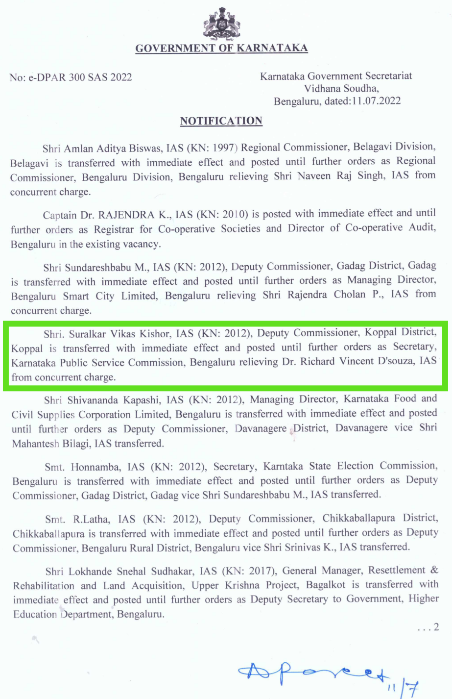 ದಿನಾಂಕ 01-07-2020 ರಂದು ಆಗಿನ ಜಿಲ್ಲಾಧಿಕಾರಿಯಾಗಿದ್ದ ಪಿ.ಸುನೀಲಕುಮಾರ ಅವರಿಂದ ಅಧಿಕಾರ ಸ್ವೀಕರಿಸಿದ್ದರು. 2 ವರ್ಷ 10 ದಿನಗಳ ಕಾಲ ಸುರಳ್ಕರ್ ವಿಕಾಸ್ ಕಿಶೋರ್ ಅವರು ಜಿಲ್ಲೆಯಲ್ಲಿ ಆಡಳಿತ ನಡೆಸಿದ್ದರು. ಕೊರೋನಾ ವೈರಸ್ ಮೊದಲನೇ ಅಲೆಯ ಆರ್ಭಟದಲ್ಲಿ ಜಿಲ್ಲಾಧಿಕಾರಿಯಾಗಿ ಉತ್ತಮ ಆಡಳಿತ ನೀಡುವಲ್ಲಿ ಯಶಸ್ವಿಯಾಗಿದ್ದನ್ನು ಜಿಲ್ಲೆಯ ಜನರು ಸ್ಮರಿಸಿಕೊಂಡಿರುವುದು ವಿಶೇಷ. ಕರ್ನಾಟಕ ಲೋಕಸೇವಾ ಆಯೋಗದ ಕಾರ್ಯದರ್ಶಿ ಹುದ್ದೆಗೆ ವರ್ಗಾವಣೆಗೊಳಿಸಿ 11-07-2022 ರಂದು ಸರಕಾರ ಹೊರಡಿಸಿದ ಆದೇಶ ಪತ್ರದಲ್ಲಿ ಸ್ಪಷ್ಟಪಡಿಸಿದೆ..!!