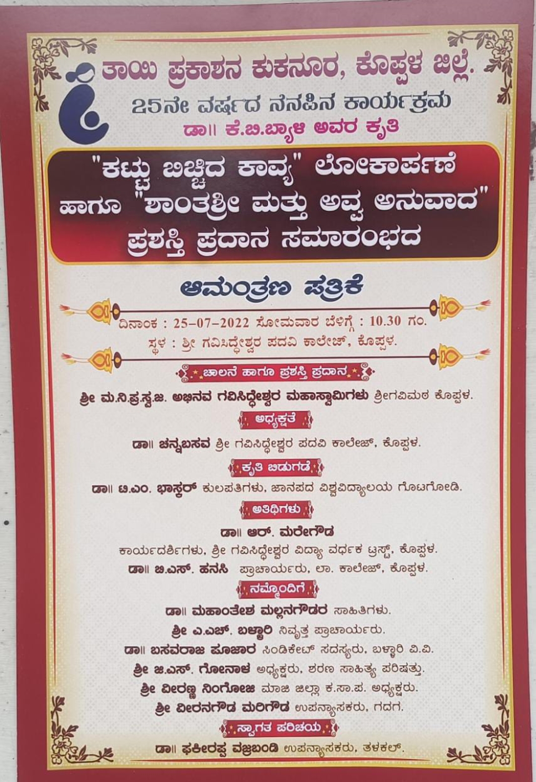 ಕೊಪ್ಪಳ : ಜಿಲ್ಲೆಯ ಕೂಕನೂರಿನ ‘ತಾಯಿ’ ಪ್ರಕಾಶನದ 25 ನೇ ವರ್ಷದ ಸವಿ ನೆನಪಿಗಾಗಿ ಹಿರಿಯ ಸಾಹಿತಿ ಡಾ.ಕೆ.ಬಿ ಬ್ಯಾಳಿ ಅವರ ರಚನೆಯ ‘ಕಟ್ಟು ಬಿಚ್ಚಿದ ಕಾವ್ಯ’ ಎಂಬ ಕೃತಿಯ ಲೋಕಾರ್ಪಣೆ ಜೊತೆಗೆ ‘ಶಾಂತಶ್ರೀ’ ಮತ್ತು ‘ಅವ್ವ ಅನುವಾದ’ ಪ್ರಶಸ್ತಿ ಪ್ರದಾನ ಸಮಾರಂಭವು ಇದೆ ಜುಲೈ 25 ರಂದು ಕೊಪ್ಪಳ ನಗರದ ಶ್ರೀ ಗವಿಸಿದ್ಧೇಶ್ವರ ಪದವಿ ಕಾಲೇಜಿನಲ್ಲಿ ಹಮ್ಮಿಕೊಳ್ಳಲಾಗಿದೆ..!