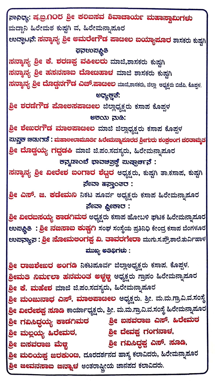 ಸ್ಥಳೀಯ ಶ್ರೀ ಗವಿಸಿದ್ಧೇಶ್ವರ ಪ್ರೌಢ ಶಾಲೆಯಲ್ಲಿ ಜರುಗುವ ಕಾರ್ಯಕ್ರಮದಲ್ಲಿ ಕುಷ್ಟಗಿಯ ಶ್ರೀ ಕರಿಬಸವ ಶಿವಾಚಾರ್ಯ ಮಹಾಸ್ವಾಮಿಗಳು ಸಾನಿಧ್ಯವಹಿಸುವರು. ಶಾಸಕ ಅಮರೇಗೌಡ ಪಾಟೀಲ ಬಯ್ಯಾಪೂರು ಕಾರ್ಯಕ್ರಮ ಉದ್ಘಾಟಿಸಲಿದ್ದಾರೆ. ಕ್ಷೇತ್ರದ ಮಾಜಿ ಶಾಸಕರಾದ ಕೆ.ಶರಣಪ್ಪ, ಹಸನಸಾಬ್ ಹಾಗೂ ದೊಡ್ಡನಗೌಡ ಉಪಸ್ಥಿತಿಯಲ್ಲಿ ಕಸಾಪ ಜಿಲ್ಲಾಧ್ಯಕ್ಷ ಶರಣೇಗೌಡ ಪೊಲೀಸ್ ಪಾಟೀಲ ಅಧ್ಯಕ್ಷತೆವಹಿಸಲಿದ್ದಾರೆ. ಹೋಬಳಿ ಘಟಕದ ಅಧ್ಯಕ್ಷ ವೀರಬಸಯ್ಯ ಕಾಡಗಿಮಠ ಇವರ ನೇತೃತ್ವದಲ್ಲಿ ಜರುಗುವ ಕಾರ್ಯಕ್ರಮದಲ್ಲಿ ಪುಸ್ತಕ ಬಿಡುಗಡೆ, ಸೇವಾ ಹಸ್ತಾಂತರ, ಸೇವಾ ಸ್ವೀಕಾರ ಸೇರಿದಂತೆ ಕನ್ನಡ ತಾಯಿಯ ಹಲವು ಕಾರ್ಯಕ್ರಮಗಳು ಜರುಗಲಿವೆ ಎಂದು ಪ್ರಕಟಣೆ ತಿಳಿಸಿದೆ..!!