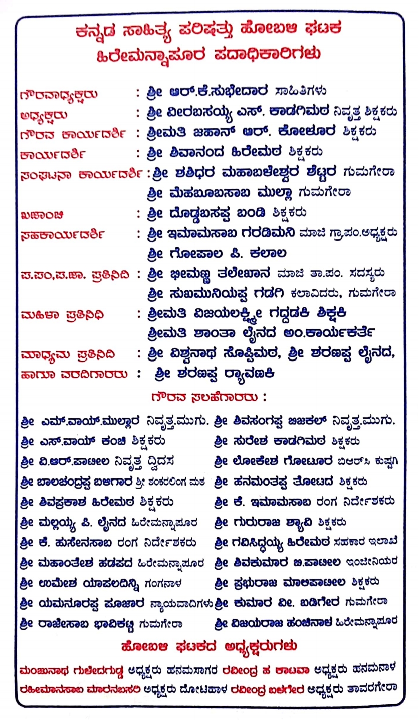 ಕೊಪ್ಪಳ : ಜಿಲ್ಲೆಯ ಕುಷ್ಟಗಿ ತಾಲೂಕಿನ ಹಿರೇಮನ್ನಾಪೂರ ಹೋಬಳಿ ಕಸಾಪ ನೂತನ ಘಟಕದ ಪದಾಧಿಕಾರಿಗಳ ಸೇವಾ ಸ್ವೀಕಾರ, ಕಾರ್ಯಚಟುವಟಿಕೆಗಳು ಮತ್ತು ಪ್ರತಿಭಾ ಪುರಸ್ಕಾರ ಕಾರ್ಯಕ್ರಮವನ್ನು ದಿನಾಂಕ 03-10-2022 ರಂದು ಹಮ್ಮಿಕೊಳ್ಳಲಾಗಿದೆ..!