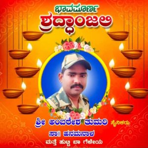 ಮಿಜೋರಾಮ ಸೇನಾಪಡೆಯಲ್ಲಿ ಸೇವೆಯಲ್ಲಿದ್ದು ಅನಾರೋಗ್ಯದಿಂದ ಹುಬ್ಬಳ್ಳಿ ಆಸ್ಪತ್ರೆಯಲ್ಲಿ ಕೊನೆಯುಸಿರೆಳೆದ ಯೋಧ ಅಂಬರೇಶ ತುಮರಿ. 22-12-2022 ರಂದು ಬೆಳಿಗ್ಗೆ ಮೃತಪಟ್ಟಿರುವ ಯೋಧನ ಕುಟುಂಬವು ಬಿ.ಎಸ್.ಎಫ್ ತುಕಡಿವೊಂದು ಗೌರವ ಸಲ್ಲಿಸಲಿಕ್ಕೆ ಆಗಮಿಸುತ್ತದೆ ಎಂದು ಇಡೀ ದಿನ ವಿನಾಕಾರಣ ಕಾಯ್ದು ಸುಸ್ತಾಗಿದೆ. ಸ್ಥಳೀಯ ನಿವೃತ್ತ ಯೋಧರ ಮಾಹಿತಿಯಂತೆ ದಿನಾಂಕ 23 ಅಂತಿಮ ಸಂಸ್ಕಾರಕ್ಕೆ ಕುಟುಂಬಸ್ಥರು ನಿರ್ಧರಿಸಿದ್ದರು. ಆದರೆ, ಮಾಹಿತಿಯಂತೆ ಬೆಂಗಳೂರಿನಿಂದ ಗೌರವ ಸಲ್ಲಿಸಲು ಆಗಮಿಸಬೇಕಾಗಿದ್ದ ಯಾವುದೇ ತುಕಡಿ ಬಾರದಿದ್ದಾಗ ಸ್ಥಳೀಯ ನೂರಾರು ಜನ ನಿವೃತ್ತ ಯೋಧರು ಸೇರಿದಂತೆ ಗ್ರಾಮಸ್ಥರ ಆಕ್ರೋಶಕ್ಕೆ ಕಾರಣವಾಗಿತು..!!
