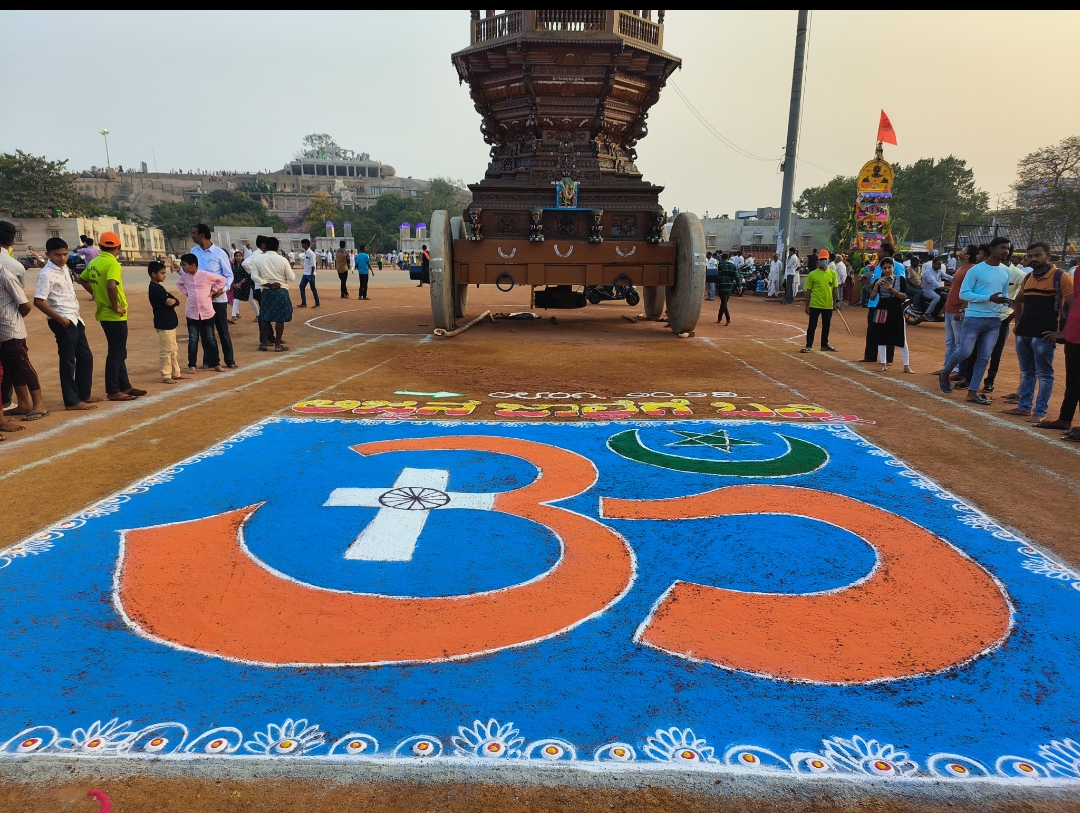 ಆಕರ್ಷಕ ರಂಗೋಲಿ : ಮಹಾ ರಥೋತ್ಸವದ ಹಿನ್ನೆಲೆಯಲ್ಲಿ ರಥೋತ್ಸವ ಜರಗುವ ರಥ ಹಾದಿಯಲ್ಲಿ ವಿದ್ಯಾರ್ಥಿಗಳು ಹಾಕಿದ ರಂಗೋಲಿ ಚಿತ್ರಗಳು ಆಕರ್ಷಕವಾಗಿ ಕಂಡು ಬಂದವು. ವಿಶೇಷವಾಗಿ ರಥದ ಮುಂಭಾಗದಲ್ಲಿಯೇ ಹಾಕಿದ ‘ಸರ್ವ ಜನಾಂಗದ ಶಾಂತಿಯ ತೋಟ’ ಎಂಬ (ಭಾವೈಕ್ಯತೆ) ಸಂದೇಶ ಸಾರುವ ರಂಗೋಲಿ ಮಾತ್ರ ಜಾತ್ರೆಗೆ ಆಗಮಿಸಿದವರನ್ನು ಕೆಲ ಸಮಯ ಹಿಡಿದಿಟ್ಟಿತು..!!