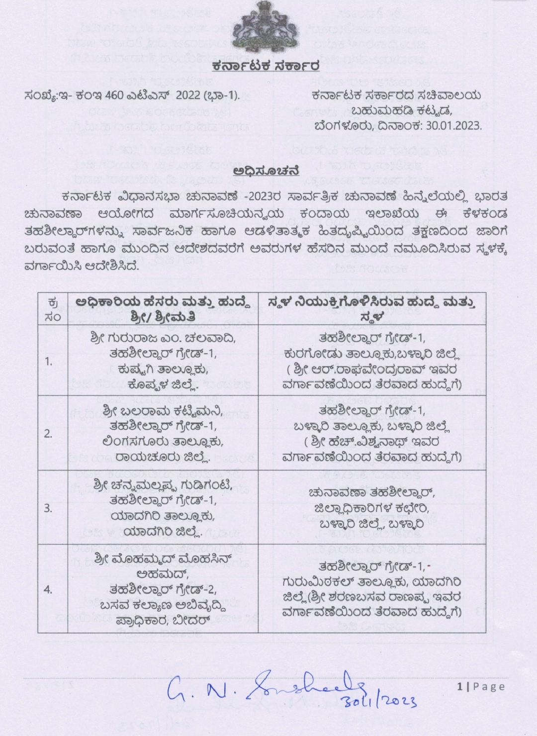 ವಿಧಾನಸಭಾ ಚುನಾವಣೆ-2023 ಹಿನ್ನೆಲೆಯಲ್ಲಿ ಚುನಾವಣೆ ಆಯೋಗದ ಮಾರ್ಗಸೂಚಿ ಅನ್ವಯ ಆಡಳಿತಾತ್ಮಕ ಹಿತದೃಷ್ಟಿಯಿಂದ ವರ್ಗಾವಣೆಗೊಳಿಸಲಾಗಿದೆ. ಕುಷ್ಟಗಿ ತಹಸೀಲ್ದಾರ ಸೇರಿದಂತೆ ರಾಜ್ಯದ 76 ಜನ ತಹಶಿಲ್ದಾರರನ್ನು ಕಂದಾಯ ಇಲಾಖೆಯ ಸರಕಾರದ ಅಧೀನ ಕಾರ್ಯದರ್ಶಿ ಜಿ.ಎನ್.ಸುಶೀಲ್ ಅವರು ಆದೇಶ ಹೊರಡಿಸಿದ್ದಾರೆ..!!