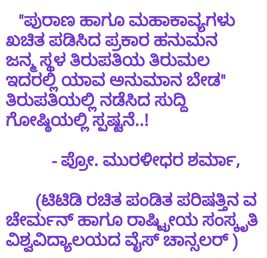 ಕೊಪ್ಪಳ: ಹನುಮಂತನ ಜನ್ಮ ಸ್ಥಳದ ಬಗ್ಗೆ ಮತ್ತೆ ಖ್ಯಾತಿ ಎತ್ತಿರುವ (ಟಿಟಿಡಿ) ತಿರುಪತಿ ತಿರುಮಲ ದೇವಸ್ಥಾನ ಟ್ರಸ್ಟ್ ನವರು ಕೊಪ್ಪಳದ ಕಿಷ್ಕೆಂದಾ ಪರ್ವತ ಪ್ರದೇಶದಲ್ಲಿಯೇ ಹನುಮಂತನ ಜನ್ಮಸ್ಥಳವಾಗಿದ್ದರ ಬಗ್ಗೆ ಪೂರಕ ದಾಖಲೆಗಳ ಸಾಬೀತಿಗೆ ಇಲ್ಲಿನ ವಿದ್ವಾಂಸರು ಹಾಗೂ ಪಂಡಿತರಿಗೆ ಒತ್ತಾಯಿಸಿದ್ದಾರೆ ..!
