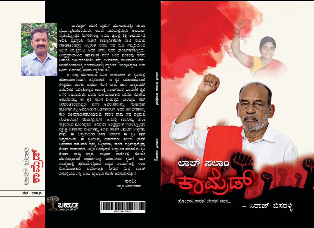 ಕೊಪ್ಪಳ : ಕೊಪ್ಪಳದ ಬಹುತ್ವ ಮೀಡಿಯಾ ಹೌಸ್, ಪ್ರಗತಿಪರ ತ್ಯಾಜ್ಯ ಸಾಗಿಸುವ ವಾಹನ ಚಾಲಕರ ಒಕ್ಕೂಟದ ಸಹಯೋಗದಲ್ಲಿ ಹೋರಾಟಗಾರ ಜೆ.ಭಾರದ್ವಾಜರ ಅಭಿನಂದನಾ ಗ್ರಂಥ ದೇಶಮಂಟೆ ಮನುಷುಲು(ಸಂ. ಸಿರಾಜ್ ಬಿಸರಳ್ಳಿ) ಹಾಗೂ ಜೀವನ ಕಥನ ‘ಲಾಲ್ ಸಲಾಂ ಕಾಮ್ರೆಡ್’ (ಸಿರಾಜ್ ಬಿಸರಳ್ಳಿ) ಎಂಬ ಎರಡು ಪುಸ್ತಕಗಳು ಲೋಕಾರ್ಪಣೆ ಗೊಳ್ಳಲಿವೆ..!