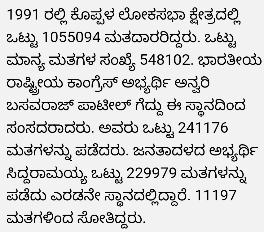 1991 ರಲ್ಲಿ ಜರುಗಿದ ಕೊಪ್ಪಳ ಲೋಕಸಭಾ ಚುನಾವಣೆಯಲ್ಲಿ ಮಾಜಿ ಮುಖ್ಯಮಂತ್ರಿ ಸಿದ್ಧರಾಮಯ್ಯನವರು (ಜನತಾ ದಳ ಪಕ್ಷದಿಂದ) ಸ್ಪರ್ಧೆ ನೀಡಿ, 11197 ಮತಗಳ ಅಂತರದಿಂದ ಪರಾಭವಗೊಂಡಿದ್ದರು. ಇದೊಂದು ರಾಜಕೀಯ ಇತಿಹಾಸ ಕೂಡಾ ಹೌದು. ಆದರೆ, ನಾವು ಸಿದ್ಧರಾಮಯ್ಯನವರು, ಹೇಗೆ ಸೋತರು, ಈ ಸೋಲಿಗೆ ಯಾರು ಕಾರಣರು, ಸೋಲಿಗೆ ಕಾರಣರಾದ ಮಹಾಶಯರು ಈ ಸಧ್ಯ ಏಲ್ಲಿದ್ದಾರೆ. ಆಗ ಸಿದ್ಧು ವಿರುದ್ಧ ಜಯಶಾಲಿಯಾದ ‘ಬಸವರಾಜ ಪಾಟೀಲ ಅನ್ವರಿ’ ಅವರು ಮುಂದಿನ ರಾಜಕೀಯ ಜೀವನದಲ್ಲಿ ಹೇಗೆ ಮೂಲೆಗುಂಪಾದರು ಎಂಬ ಇತ್ಯಾದಿ ರಾಜಕೀಯ ಇತಿಹಾಸ ಕುರಿತು ನಾವು ಹೇಳಲು ಹೋರಟಿಲ್ಲ. ಆದರೆ, ಸಿದ್ಧರಾಮಯ್ಯನವರ ಆಗಿನ ಸೋಲಿನಲ್ಲಿಯೂ ಕುಷ್ಟಗಿ ವಿಧಾನಸಭಾ ಕ್ಷೇತ್ರದ ಮತದಾರ ಪ್ರಭುಗಳು ಮಾತ್ರ ಇವರನ್ನು ಕೈಹಿಡಿದು, ಸಾವಿರಕ್ಕೂ ಅಧಿಕ ಮತಗಳನ್ನು ಜಯಶಾಲಿಯಾದ ಅಭ್ಯರ್ಥಿಗಿಂತ ಹೆಚ್ಚು ಮತಗಳನ್ನು ಈ ಕುಷ್ಟಗಿ ವಿಧಾನಸಭಾ ಕ್ಷೇತ್ರದ ಜನರು ನೀಡಿದ್ದು ರಾಜಕೀಯವಾಗಿ ಇತಿಹಾಸ ಸೃಷ್ಟಿ ಅಂದರೆ ತಪ್ಪಾಗಲಿಕ್ಕಿಲ್ಲ. ರಾಜ್ಯದಲ್ಲಿಯೇ ಅತಿ ಹೆಚ್ಚು ಹಾಲುಮತ ಸಮುದಾಯದ ಮತದಾರರನ್ನು ಹೊಂದಿದ ಕೊಪ್ಪಳ ಲೋಕಸಭಾ ಕ್ಷೇತ್ರ ಎಂಬ ಲೆಕ್ಕಾಚಾರದ ಮೂಲಕ ಕೊಪ್ಪಳ ಲೋಕಸಭಾ ಕ್ಷೇತ್ರದಲ್ಲಿ ಸ್ಪರ್ಧೆ ನೀಡಿ, ಅಂದು ಸೋಲನ್ನು ಕಾಣಲಿಲ್ಲ ಎಂದರೆ, ನಾನು ಈ ರಾಜ್ಯದ ಮುಖ್ಯಮಂತ್ರಿ ಆಗುತ್ತಿದ್ದಿಲ್ಲ ಎಂಬ ಮಾತುಗಳನ್ನು ಕೂಡಾ ಸ್ವತಃ ಸಿದ್ಧರಾಮಯ್ಯನವರು ಬಹಿರಂಗವಾಗಿ ಹೇಳಿಕೊಂಡಿರುವುದು ವಿಶೇಷ. ಆದರೆ, ಅಂದಿನ ಸೋಲಿನ ಕಹಿ ಕನಸಿನ ಮಧ್ಯೆಯೂ ಕುಷ್ಟಗಿ ವಿಧಾನಸಭಾ ಕ್ಷೇತ್ರದ ಜನ ಸಿದ್ಧು ಅವರನ್ನು ಕೈಹಿಡಿದಿರುವುದಂತು ಎಂದಿಗೂ ಮರೆಯಲಾರದಂತದ್ದು. ಅಂದು ಸಿದ್ಧರಾಮಯ್ಯನವರಿಗೆ ಹೆಚ್ಚು ಮತಗಳನ್ನು ನೀಡಿರುವ ಸುದ್ದಿ ಮಾತ್ರ ಸಧ್ಯದ ರಾಜಕೀಯ ಚರ್ಚೆಯಲ್ಲಿ ಬಹಳಷ್ಟು ಮಹತ್ವವನ್ನು ಪಡೆದುಕೊಂಡಿದೆ. ಅಷ್ಟೇ ಅಲ್ಲ, ಕುಷ್ಟಗಿ ಸೇರಿದಂತೆ ರಾಜ್ಯಾದ್ಯಂತ ಇರುವ ‘ಸಿದ್ಧು’ ಅಭಿಮಾನಿಗಳು ತಮ್ಮ ನಾಯಕ ಕುಷ್ಟಗಿ ವಿಧಾನಸಭಾ ಕ್ಷೇತ್ರದಿಂದಲೇ ಈ ಬಾರಿ ಸ್ಪರ್ಧೆ ನೀಡಬೇಕು ಎಂಬ ಕೂಗೂ ಕೂಡಾ ಸಾಕಷ್ಟು ಕೇಳಿಬರುತ್ತಿದೆ..!!