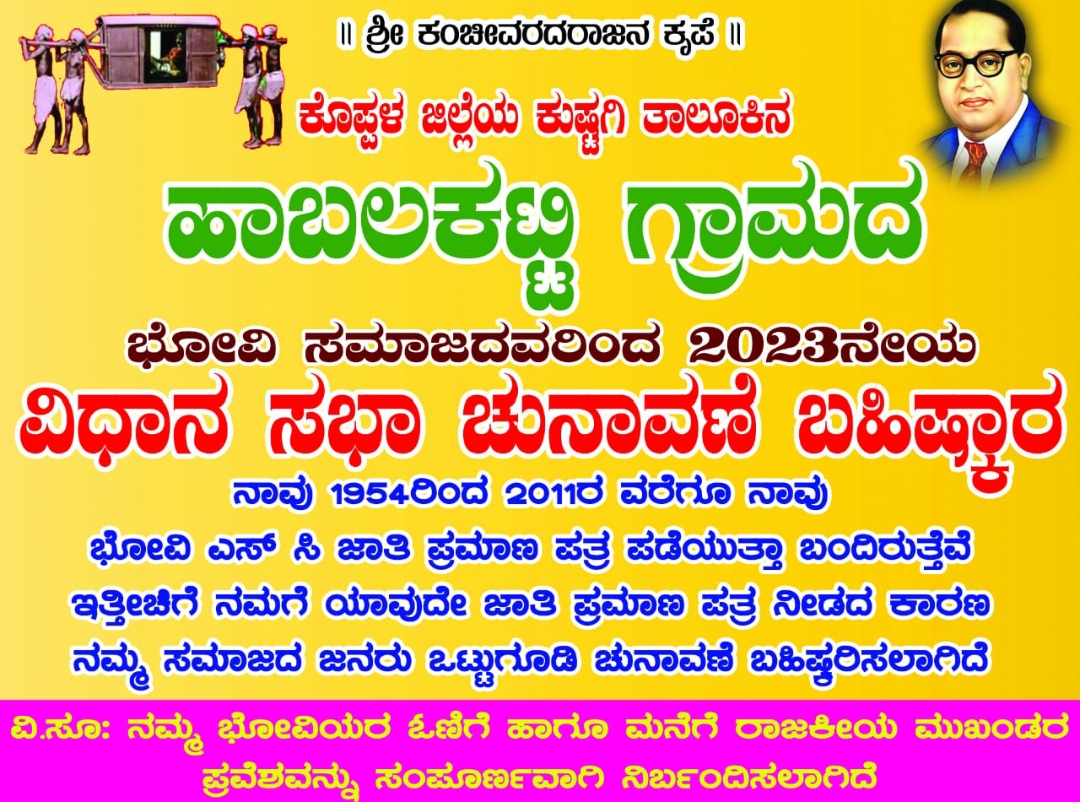 ಕೊಪ್ಪಳ : ಜಿಲ್ಲೆಯ ಕುಷ್ಟಗಿ ತಾಲೂಕಿನ ಹಾಬಲಕಟ್ಟಿ ಗ್ರಾಮದ ಭೋವಿ ಸಮುದಾಯದವರು ಚುನಾವಣೆಯ ಮತದಾನ ಬಹಿಷ್ಕಾರಕ್ಕೆ ಮುಂದಾಗಿದ್ದಾರೆ..!
