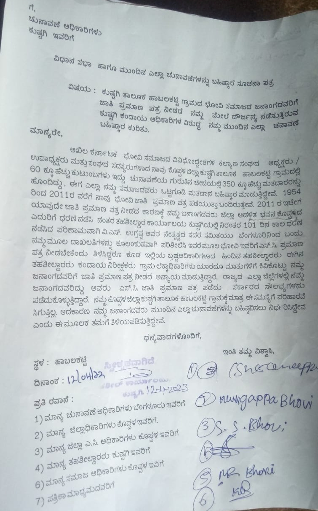 ಹಾಬಲಕಟ್ಟಿ ಗ್ರಾಮದಲ್ಲಿ ವಾಸವಾಗಿದ್ದ ‘ಭೋವಿ’ ಸಮುದಾಯದವರಿಗೆ ಕಳೆದ 1954 ರಿಂದ 2011 ರವರೆಗೆ ಪರಿಶಿಷ್ಟ ಜಾತಿ ಪ್ರಮಾಣ ಪತ್ರ ನೀಡಲಾಗುತ್ತಿತ್ತು. ಆದರೆ, 2011 ರ ಬಳಿಕ ಸಮುದಾಯದವರಿಗೆ ಯಾವುದೇ ಪ್ರಮಾಣ ಪತ್ರವನ್ನು ತಾಲೂಕಿನಲ್ಲಿ ನೀಡುತ್ತಿಲ್ಲ. ಪ್ರಮಾಣ ಪತ್ರಗಳಿಲ್ಲದೆ ಸಮುದಾಯದ ನೂರಾರು ವಿದ್ಯಾರ್ಥಿಗಳು ಸರಕಾರಿ ಉದ್ಯೋಗ ಸೇರಿದಂತೆ ಅನೇಕ ಮೀಸಲಾತಿ ಸೌಲಭ್ಯಗಳಿಂದ ವಂಚಿತಾರಾಗುತ್ತಾ ಬಂದಿದ್ದಾರೆ. ಸಮುದಾಯದವರಿಗೆ ಈ ಮೊದಲು ನೀಡುತ್ತಿದ್ದ ‘ಪರಿಶಿಷ್ಟ ಜಾತಿ’ ಪ್ರಮಾಣ ಪತ್ರ ನೀಡಬೇಕೆಂಬ ಪ್ರಮುಖ ಬೇಡಿಕೆ ಮುಂದಿಟ್ಟುಕೊಂಡ ಭೋವಿ ಸಮುದಾಯದವರು ವಿಧಾನಸಭೆ ಚುನಾವಣೆ ಬಹಿಷ್ಕಾರಕ್ಕೆ ಮುಂದಾಗಿರುವ ಕುರಿತು ದಿನಾಂಕ 12-04-2023 ರಂದು ತಹಸೀಲ್ದಾರ ಕಚೇರಿಗೆ ಮನವಿ ಪತ್ರ ಸಲ್ಲಿಸಿದ್ದಾರೆ.