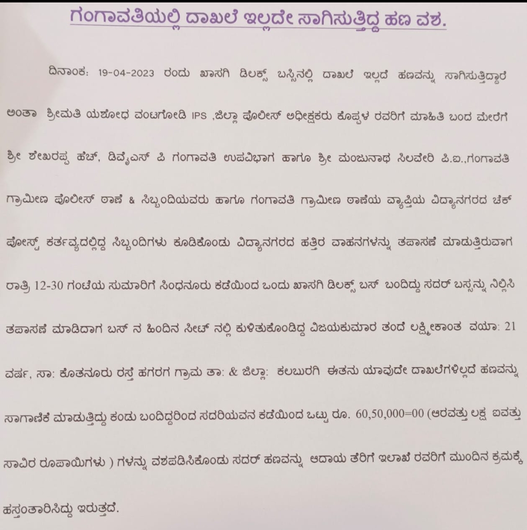 ಕೊಪ್ಪಳ : ಜಿಲ್ಲೆಯ ಗಂಗಾವತಿ ಗ್ರಾಮೀಣ ಠಾಣೆಯ ಪೊಲೀಸರು ಖಾಸಗಿ ಬಸ್ ನಲ್ಲಿ ಪ್ರಯಾಣಿಸುತ್ತಿದ್ದ ವ್ಯಕ್ತಿಯಿಂದ 60,50,000=00 ರೂಪಾಯಿಗಳನ್ನು ವಶಪಡಿಸಿಕೊಂಡಿರುವ ಪ್ರಸಂಗ ಜರುಗಿದೆ..!