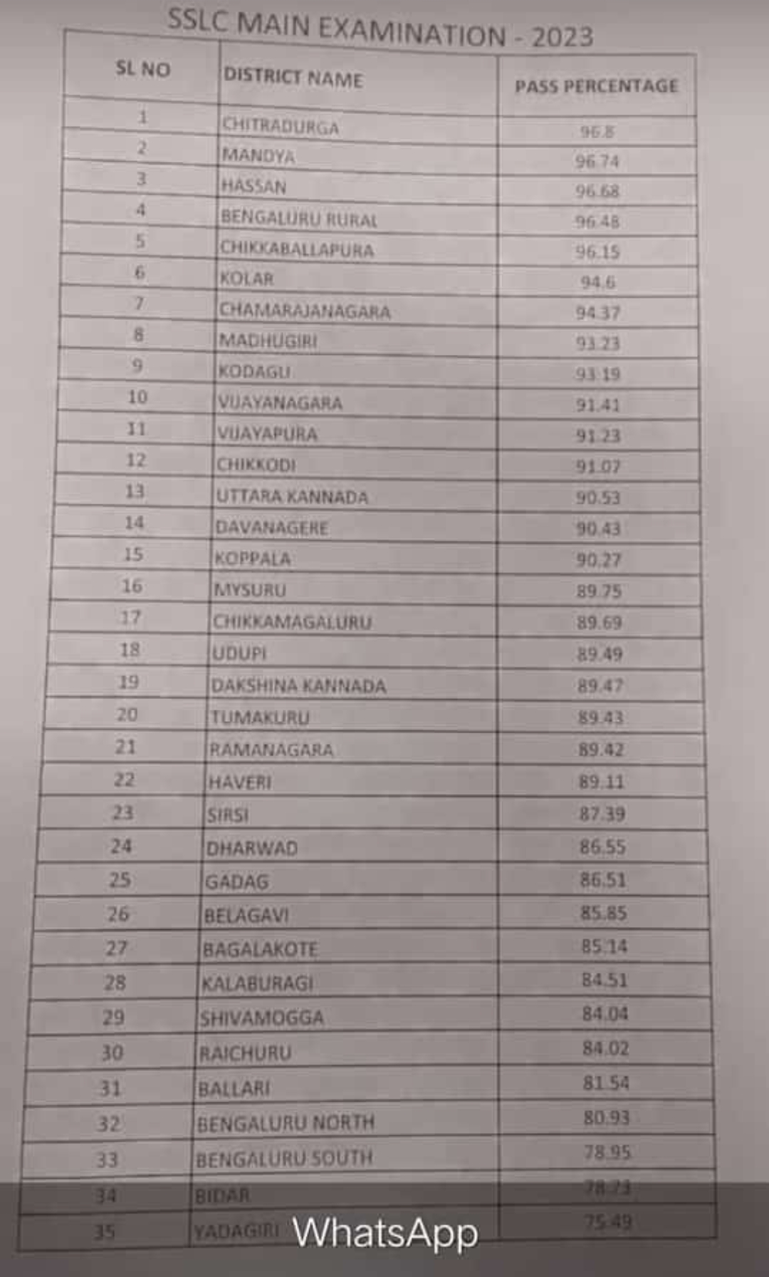 ಶೇ. 96.8 ಪಡೆಯುವ ಮೂಲಕ ಚಿತ್ರದುರ್ಗ ಜಿಲ್ಲೆ ಮೊದಲ ಸ್ಥಾನಕ್ಕೆರಿದೆ. ಶೇ. 96.74 ಪಡೆದ ಮಂಡ್ಯ ಜಿಲ್ಲೆ ಎರಡನೇ ಸ್ಥಾನದಲ್ಲಿದೆ. ಎಂದಿನಂತೆ ಯಾದಗಿರಿ ಜಿಲ್ಲೆ ಕೊನೆಯ ಸ್ಥಾನ ಕಾಯ್ದುಕೊಂಡಿದೆ ಎಂದು ಶಿಕ್ಷಣ ಇಲಾಖೆ ಮೂಲಗಳು ಸ್ಪಷ್ಟಪಡಿಸಿವೆ..!!