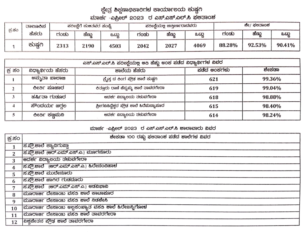ಕುಷ್ಟಗಿ ತಾಲೂಕಿನ ತಾವರಗೇರಾ ಪಟ್ಟಣದ ಕಿತ್ತೂರು ರಾಣಿ ಚನ್ನಮ್ಮ ವಸತಿ ಶಾಲೆ ವಿದ್ಯಾರ್ಥಿನಿ ಕೀರ್ತಿ ಪೂಜಾರ (619), ತಳುವಗೇರಾ ಆದರ್ಶ ವಿದ್ಯಾಲಯದ ವಿದ್ಯಾರ್ಥಿನಿ ಹರ್ಷಿತಾ ಗುಡೂರು (618), ಹಿರೇಮನ್ನಾಪೂರು ಶ್ರೀ ಗವಿಸಿದ್ಧೇಶ್ವರ ಪ್ರೌಢ ಶಾಲೆಯ ವಿದ್ಯಾರ್ಥಿನಿ ಸೌಂದರ್ಯ ಜಗ್ಗಲ (615) ಹಾಗೂ ತಳುವಗೇರಾ ಆದರ್ಶ ವಿದ್ಯಾಲಯದ ವಿದ್ಯಾರ್ಥಿನಿ ಕೀರ್ತಿ ಕಟ್ಟಿಮನಿ (614) ಅಂಕಗಳನ್ನು ಪಡೆದು ತಾಲೂಕಿನ ಕೀರ್ತಿಗೆ ಪಾತ್ರರಾಗಿದ್ದಾರೆ. ಅಲ್ಲದೆ, ತಾಲೂಕಿನ 12 ಶಾಲೆಗಳು ಶೇಕಡಾ ನೂರಕ್ಕೆ ನೂರರಷ್ಟು ಫಲಿತಾಂಶ ಪಡೆದುಕೊಂಡಿವೆ ಎಂದು ಹೆಮ್ಮೆ ವ್ಯಕ್ತಪಡಿಸಿದ ಕ್ಷೇತ್ರ ಶಿಕ್ಷಣಾಧಿಕಾರಿ ಸುರೇಂದ್ರ ಕಾಂಬಳೆ ಪ್ರಕಟಣೆಯಲ್ಲಿ ತಿಳಿಸಿದ್ದಾರೆ..!!