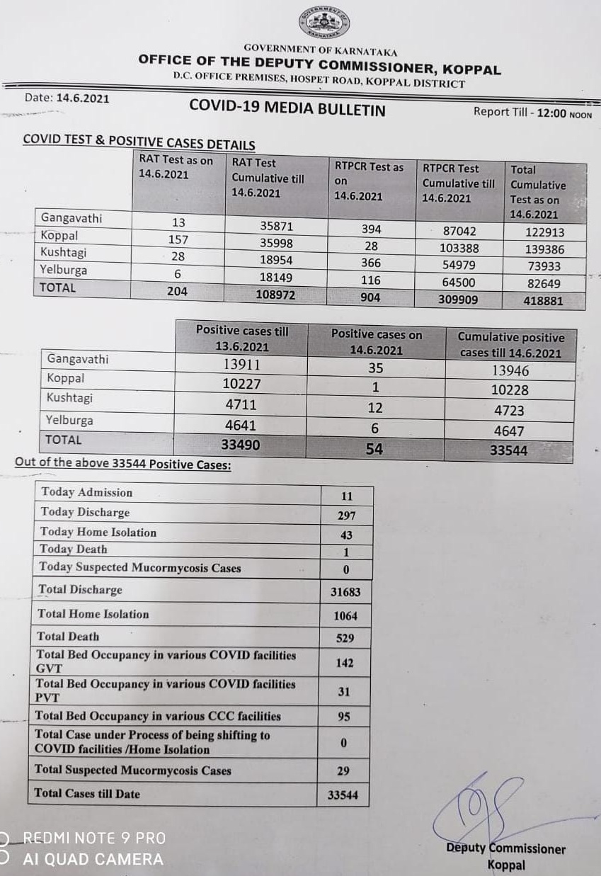 ನಿತ್ಯ ನೂರಕ್ಕೂ ಅಧಿಕ ಸಂಖ್ಯೆಯಲ್ಲಿ ಸೋಂಕಿತರನ್ನು ಗುರುತಿಸಲಾಗುತ್ತಿದ್ದ ಕೊಪ್ಪಳ ತಾಲೂಕಿನಲ್ಲಿ 14-06-2021 ರಂದು ಕೇವಲ ಒಬ್ಬರಿಗೆ ಮಾತ್ರ ಸೋಂಕು ದೃಢವಾಗಿರುವುದು ವಿಶೇಷ. ಗಂಗಾವತಿ ಅಖಂಡ ತಾಲೂಕಿನಲ್ಲಿ 35 ಜನರಿಗೆ ಸೋಂಕು ದೃಢವಾದರೆ, ತೀವ್ರವಾಗಿ ನಿಯಂತ್ರಣಕ್ಕೆ ಬಂದಿರುವ ಕುಷ್ಟಗಿ ತಾಲೂಕಿನಲ್ಲಿ 12 ಜನರಿಗೆ ಹಾಗೂ ಯಲಬುರ್ಗಾ ತಾಲ್ಲೂಕಿನಲ್ಲಿ 6 ಜನರಿಗೆ ಸೋಂಕು ದೃಢವಾಗಿರುವುದು ಸ್ಪಷ್ಟವಾಗಿದೆ. ಕೊರೋನಾ ವೈರಸ್ ಜಿಲ್ಲೆಯಲ್ಲಿ ತೀವ್ರವಾಗಿ ನಿಯಂತ್ರಣಕ್ಕೆ ಬಂದಿರುವುದನ್ನು ಗಮನಿಸಿದ ಜಿಲ್ಲೆಯ ಜನರು ನಿಟ್ಟುಸಿರು ಬಿಟ್ಟಿದ್ದಾರೆ. ಅಲ್ಲದೆ, ಜಿಲ್ಲಾಡಳಿತದ ಶ್ರಮಕ್ಕೆ ಅಭಿನಂದಿಸಿದ್ದಾರೆ..!!