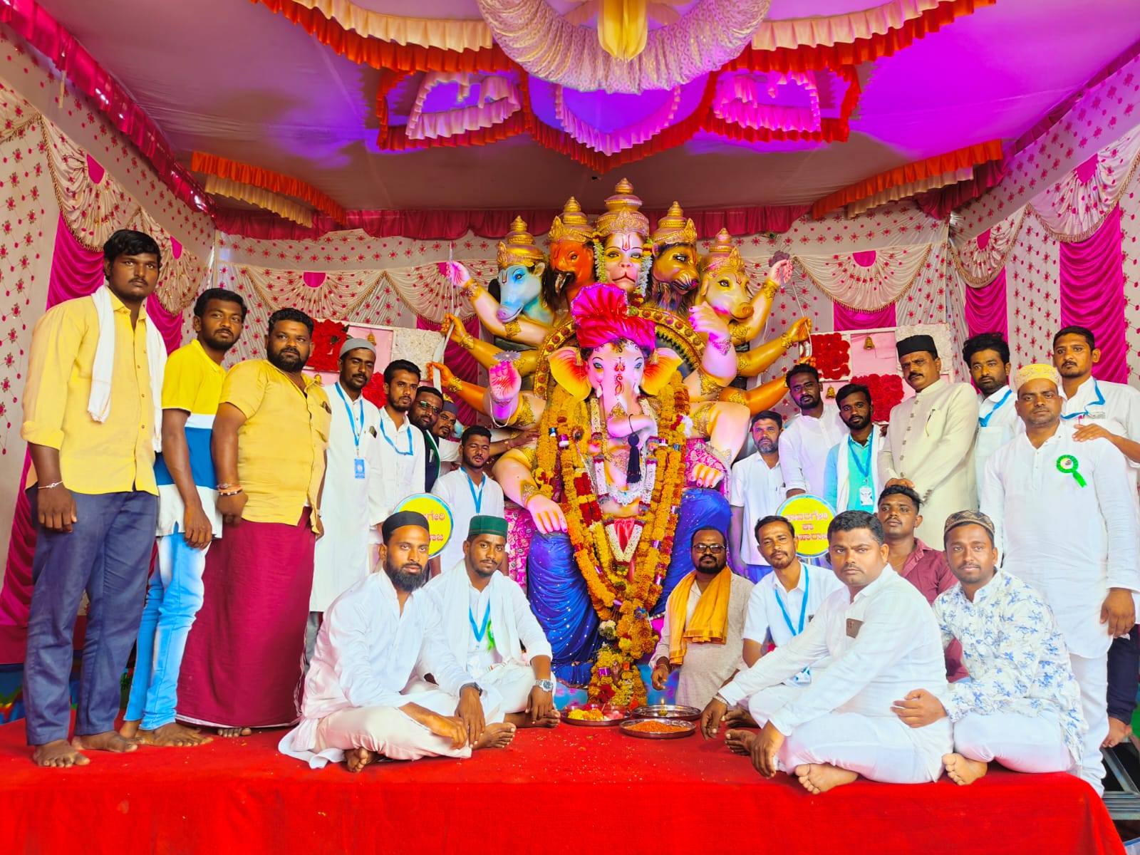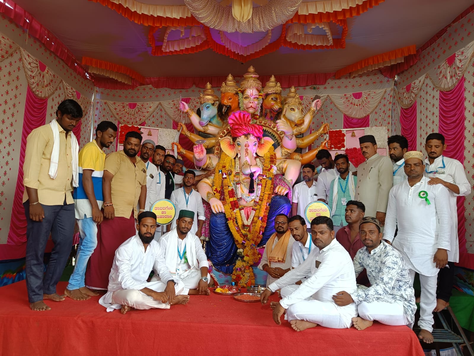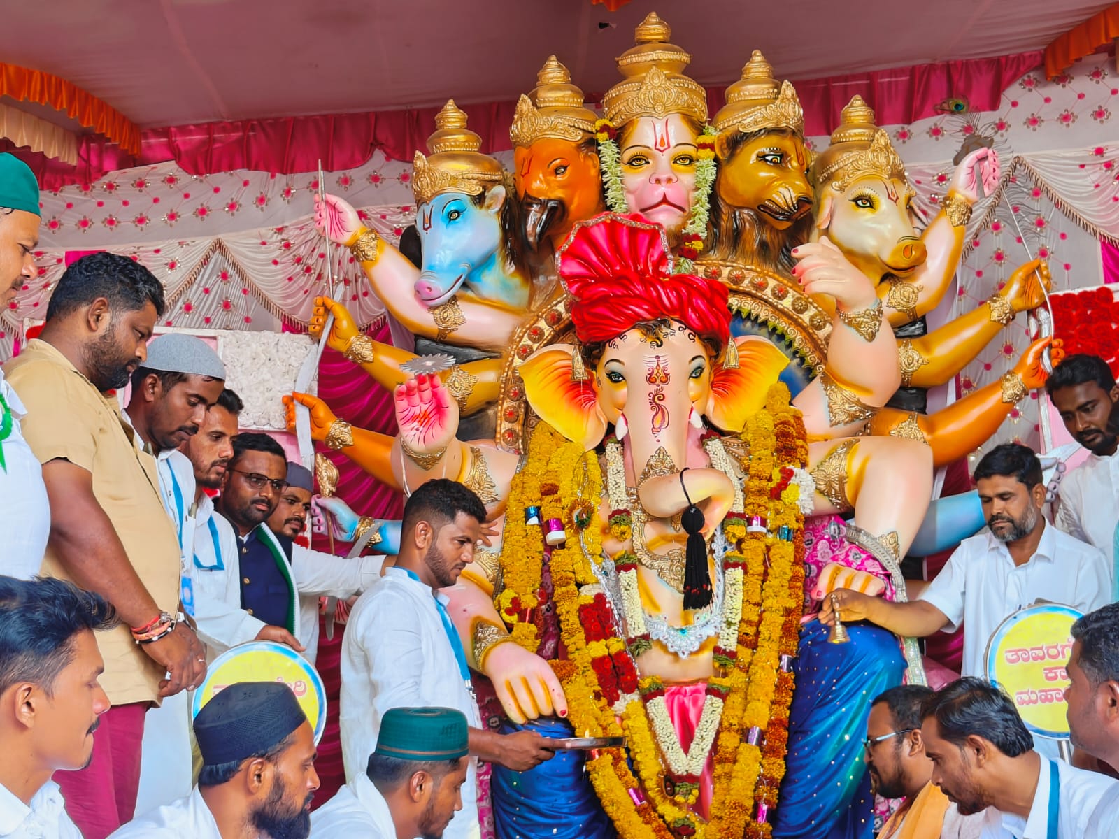 ಪಟ್ಟಣದ 14ನೇ ವಾರ್ಡ್ ಶ್ರೀ ವೀರಭದ್ರೇಶ್ವರ ನಗರದಲ್ಲಿ ಪ್ರತಿಷ್ಠಾಪನೆ ಮಾಡಲಾಗಿರುವ 13 ಅಡಿಯ ಬೃಹದಾಕಾರದ ತಾವರಗೇರಿಕಾ ಮಹಾರಾಜ್ ಮಣ್ಣಿನ ಗಣೇಶ ಮೂರ್ತಿಯನ್ನು ಮುಸ್ಲಿಂ ಬಾಂಧವರು ಸ್ವತಃ ಮೂರ್ತಿ ಪ್ರತಿಷ್ಠಾಪನೆ ಸ್ಥಳಕ್ಕೆ ತೆರಳಿ ಗಣೇಶನಿಗೆ ಪುಷ್ಪ ಸಮರ್ಪಿಸಿ ವಿಶೇಷ ಆರತಿ ಪೂಜೆ ನೆರವೇರಿಸಿ ಪ್ರಾರ್ಥನೆ ಸಲ್ಲಿಸುವ ಮೂಲಕ ಈದ್ ಮಿಲಾದ್ ಹಬ್ಬ ಆಚರಿಸಿ ನಾವೆಲ್ಲರೂ ಒಂದೇ ಎಂಬ ಸಂದೇಶ ಸಾರಿದರು.