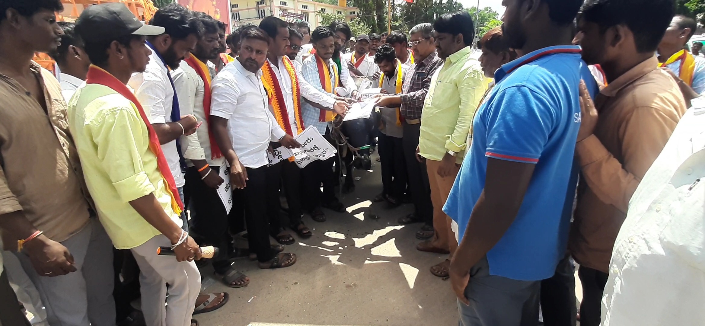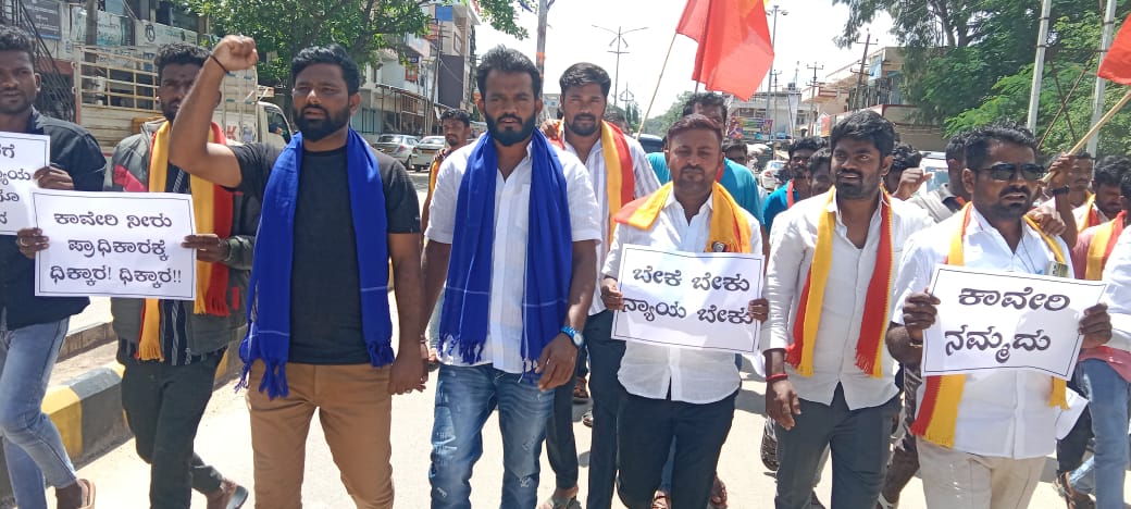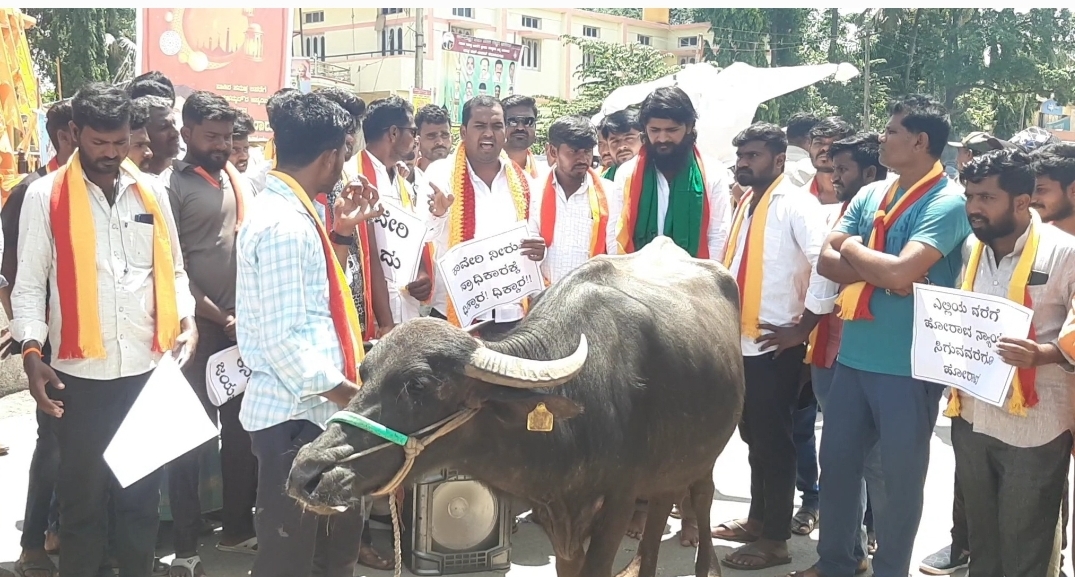 ಪಟ್ಟಣದಲ್ಲಿ ಕರ್ನಾಟಕ ರಕ್ಷಣಾ ವೇದಿಕೆ ಸ್ವಾಭಿಮಾನಿ ಬಣ, ವೀರಕನ್ನಡಿಗರ ಕರ್ನಾಟಕ ರಕ್ಷಣಾ ವೇದಿಕೆ, ದಲಿತ ಸಂಘಟನೆ, ಪ್ರಜಾಶಕ್ತಿ ಸಂಘಟನೆಗಳ ಕೆಲವರು ಸಮಾವೇಶಗೊಂಡು ಕಾವೇರಿ ನೀರನ್ನು ತಮಿಳುನಾಡಿಗೆ ಬಿಟ್ಟಿರುವುದಕ್ಕೆ ಆಕ್ಷೇಪ ವ್ಯಕ್ತಪಡಿಸಿ ರಾಜ್ಯ ಸರ್ಕಾರದ ನಡೆ ಖಂಡಿಸಿ ಎಮ್ಮೆ ಮುಂದಿಟ್ಟುಕೊಂಡು ಪ್ರತಿಭಟನೆ ನಡೆಸಿದರು.