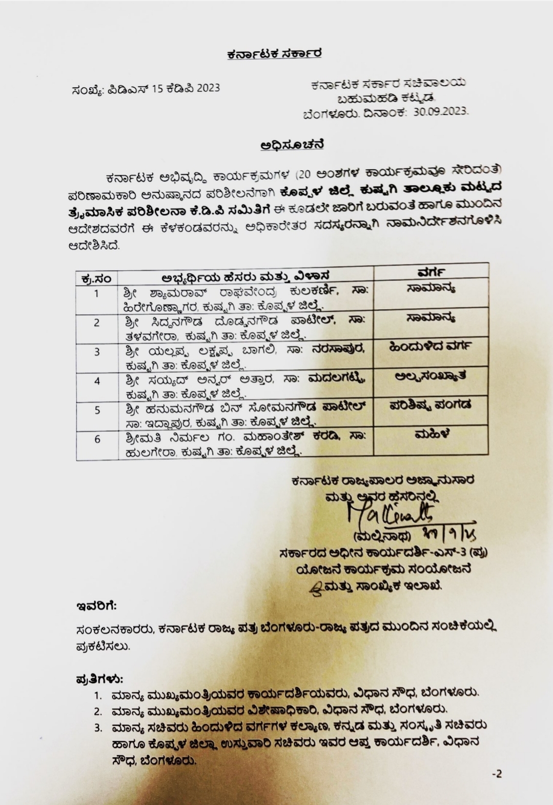 ಸಾಮಾನ್ಯ ವರ್ಗಕ್ಕೆ ತಾಲೂಕಿನ ಹಿರೇಗೊಣ್ಣಾಗರದ ಶ್ಯಾಮರಾವ ರಾಘವೇಂದ್ರ ಕುಲಕರ್ಣಿ, ತಳುವಗೇರಾದ ಸಿದ್ದನಗೌಡ ದೊಡ್ಡನಗೌಡ ಪಾಟೀಲ್, ಹಿಂದುಳಿದ ವರ್ಗದ ನರಸಾಪೂರಿನ ಯಲ್ಲಪ್ಪ ಲಕ್ಷ್ಮಪ್ಪ ಬಾಗಲಿ, ಅಲ್ಪಸಂಖ್ಯಾತ ವರ್ಗದ ಕುಷ್ಟಗಿ ಪಟ್ಟಣದ ಸೈಯದ್ ಅನ್ವರ್ ಅತ್ತಾರ, ಪರಿಷಳಶಿಷ್ಟ ಪಂಗಡದಿಂದ ಇದ್ಲಾಪೂರದ ಹನುಮಗೌಡ ಸೋಮನಗೌಡ ಪಾಟೀಲ್ ಹಾಗೂ ಮಹಿಳಾ ಕ್ಷೇತ್ರದಿಂದ ಹೂಲಗೇರಾದ ನಿರ್ಮಲಾ ಮಹಾಂತೇಶ ಕರಡಿ ಇವರುಗಳನ್ನು ರಾಜ್ಯಪಾಲರ ಆಜ್ಞಾನುಸಾರ ಅವರ ಹೆಸರಿನಲ್ಲಿ ಯೋಜನೆ ಕಾರ್ಯಕ್ರಮ ಸಂಯೋಜನೆ ಮತ್ತು ಸಾಂಖಿಕ ಇಲಾಖೆ ಸರ್ಕಾರದ ಅಧೀನ ಕಾರ್ಯದರ್ಶಿ ಮಲ್ಲಿನಾಥ ಅವರು ಕುಷ್ಟಗಿ ತಾಲೂಕು ಮಟ್ಟದ ತ್ರೈಮಾಸಿಕ ಪರಿಶೀಲನಾ ಕೆಡಿಪಿ ಸಮಿತಿಗೆ ಸದಸ್ಯರನ್ನಾಗಿ ನಾಮನಿರ್ದೇಶನಗೊಳಿಸಲಾಗಿದೆ ಎಂದು ದಿನಾಂಕ 30-09-2023 ರಂದು ಹೊರಡಿಸಿರುವ ಆದೇಶದಲ್ಲಿ ತಿಳಿಸಿದ್ದಾರೆ.