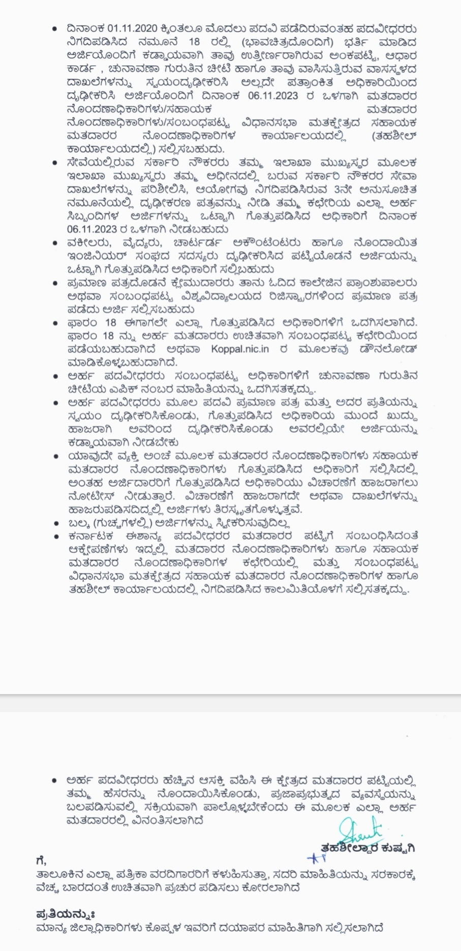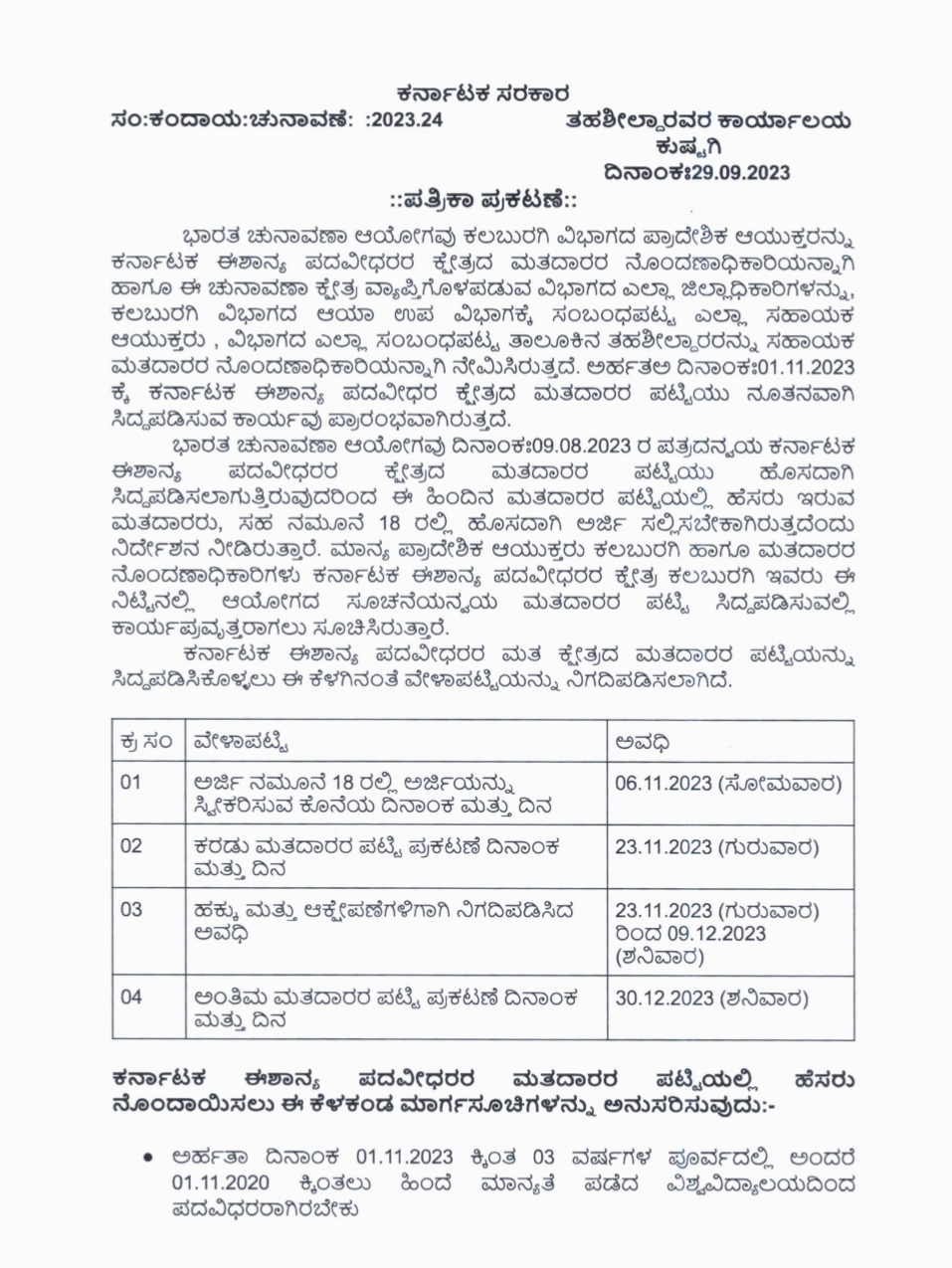 ಅರ್ಹತಾ ದಿನಾಂಕ 01.11.2023ಕ್ಕೆ ಕರ್ನಾಟಕ ಈಶಾನ್ಯ ಪದವೀಧರ ಕ್ಷೇತ್ರದ ಮತದಾರರ ಪಟ್ಟಿಯು ನೂತನವಾಗಿ ಸಿದ್ದಪಡಿಸುವ ಕಾರ್ಯವು ಪ್ರಾರಂಭವಾಗುತ್ತದೆ. ಕರ್ನಾಟಕ ಈಶಾನ್ಯ ಪದವೀಧರರ ಮತಕ್ಷೇತ್ರದ ಮತದಾರರ ಪಟ್ಟಿಯು ಹೊಸದಾಗಿ ಸಿದ್ದಪಡಿಸಲಾಗುತ್ತಿರುವುದರಿಂದ ಈ ಹಿಂದಿನ ಮತದಾರರ ಪಟ್ಟಿಯಲ್ಲಿ ಹೆಸರು ಇರುವ ಮತದಾರರು ಸಹ ನಮೂನೆ 18 ರಲ್ಲಿ ಹೊಸದಾಗಿ ಅರ್ಜಿ ಸಲ್ಲಿಸಬೇಕಾಗಿರುತ್ತದೆ ಎಂದು ಭಾರತ ಚುನಾವಣಾ ಆಯೋಗವು ನಿರ್ದೇಶನ ನೀಡಿದೆ.