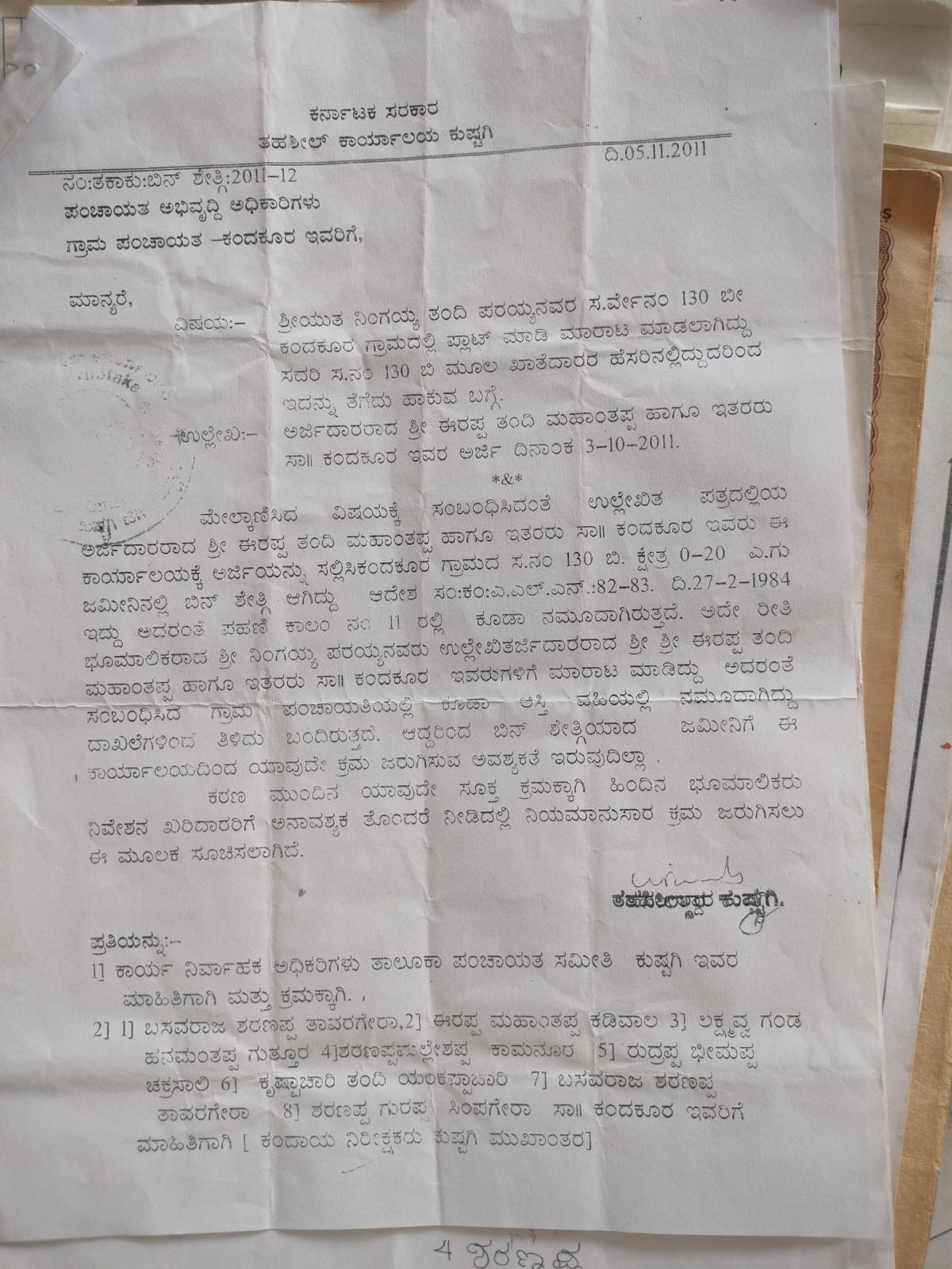 ತಾಲೂಕಿನ ಕಂದಕೂರು ಗ್ರಾಮದ ಪ್ರಭುಲಿಂಗಯ್ಯ ಮಠಪತಿ ಅವರ ತಂದೆ ನಿಂಗಯ್ಯ ತಂದಿ ಪರಯ್ಯ ಮಠಪತಿಯವರು ಕಂದಕೂರು ಸೀಮೆ ವ್ಯಾಪ್ತಿಯಲ್ಲಿ ಬರುವ ತಮಗೆ ಸೇರಿದ 20 ಗುಂಟೆ ಕೃಷಿ ಜಮೀನನ್ನು ಬಿನ್ ಸೇತಿಗಿ ಜಾಗೆಯನ್ನಾಗಿ ಪರಿವರ್ತಿಸಿಕೊಂಡು ಸ್ಥಳೀಯ ಗ್ರಾಮ ಪಂಚಾಯಿತಿಯಲ್ಲಿ ದಾಖಲೆ ಮಾಡಿಸಿಕೊಂಡಿದ್ದಾರೆ. ಅಲ್ಲಿ 48×58 ಅಳತೆಯ 8 ನಿವೇಶನಗಳನ್ನು ರಚನೆ ಮಾಡಿ ಕಂದಕೂರು ಗ್ರಾಮಸ್ಥರಿಗೆ 1984ರಲ್ಲಿ ಮಾರಾಟ ಮಾಡಿದ್ದಾರೆ.