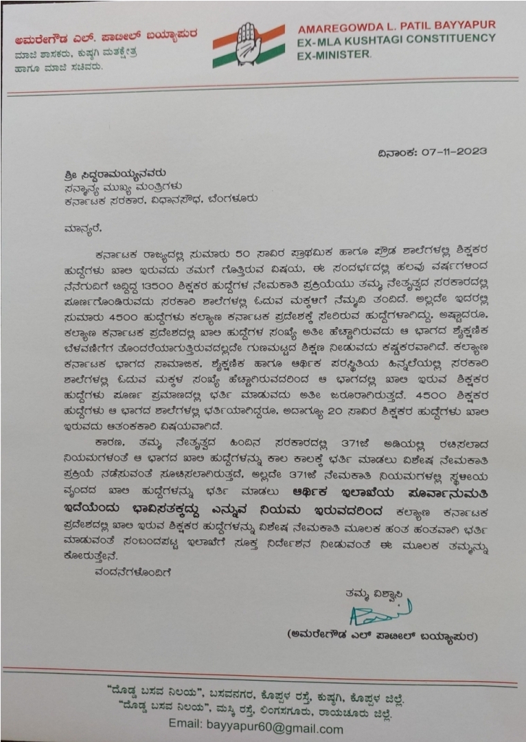 ಈ ಕುರಿತು ಮುಖ್ಯಮಂತ್ರಿ ಸಿದ್ದರಾಮಯ್ಯ ಅವರಿಗೆ ದಿನಾಂಕ 07-11-2023 ರಂದು ಬರೆದ ಮನವಿ ಪತ್ರದಲ್ಲಿ ಕೋರಿದ್ದಾರೆ. ಹಲವು ವರ್ಷಗಳಿಂದ ನೆನೆಗುದಿಗೆ ಬಿದ್ದಿದ್ದ 13500 ಶಿಕ್ಷಕರ ಹುದ್ದೆಗಳ ನೇಮಕಾತಿ ಪ್ರಕ್ರಿಯೆಯು ತಮ್ಮ ನೇತೃತ್ವದ ಸರಕಾರದಲ್ಲಿ ಪೂರ್ಣಗೊಂಡಿರುವದು ಸರಕಾರಿ ಶಾಲೆಗಳಲ್ಲಿ ಓದುವ ಮಕ್ಕಳಿಗೆ ನೆಮ್ಮದಿ ತಂದಿದೆ. ಅದರಲ್ಲಿ ಸುಮಾರು 4500 ಹುದ್ದೆಗಳು ಕಲ್ಯಾಣ ಕರ್ನಾಟಕ ಪ್ರದೇಶದಲ್ಲಿ ಭರ್ತಿಯಾಗಿದ್ದರೂ ಸಹ 20 ಸಾವಿರ ಶಿಕ್ಷಕರ ಹುದ್ದೆಗಳು ಖಾಲ ಇರುವದು ಆತಂಕಕಾರಿ ವಿಷಯ. ಸಾಮಾಜಿಕ, ಶೈಕ್ಷಣಿಕ ಹಾಗೂ ಆರ್ಥಿಕ ಪರಸ್ಥಿತಿ ಹಿನ್ನಲೆ ಈ ಭಾಗದಲ್ಲಿ ಸರಕಾರಿ ಶಾಲೆಗಳಲ್ಲಿ ಓದುವ ಮಕ್ಕಳ ಸಂಖ್ಯೆ ಹೆಚ್ಚಾಗಿದ್ದು, ಖಾಲಿಯಿರುವ ಹುದ್ದೆಗಳ ಭರ್ತಿ ಮಾಡುವುದು ಜರೂರಿದೆ. ತಮ್ಮ ನೇತೃತ್ವದ ಹಿಂದಿನ ಸರಕಾರದಲ್ಲಿ. 371ಜೆ ಅಡಿಯಲ್ಲಿ ರಚಿಸಲಾದ ನಿಯಮಗಳಂತೆ ಕಲ್ಯಾಣ ಕರ್ನಾಟಕ ಭಾಗದ ಖಾಲಿ ಹುದ್ದೆಗಳನ್ನು ಕಾಲ ಕಾಲಕ್ಕೆ ಭರ್ತಿ ಮಾಡಲು ವಿಶೇಷ ನೇಮಕಾತಿ ಪ್ರಕ್ರಿಯೆ ನಡೆಸುವಂತೆ ಸೂಚಿಸಲಾಗಿರುತ್ತದೆ, ಅಲ್ಲದೇ 371ಜೆ ನೇಮಕಾತಿ ನಿಯಮಗಳಲ್ಲಿ ಸ್ಥಳೀಯ ವೃಂದದ ಖಾಲಿ ಹುದ್ದೆಗಳನ್ನು ಭರ್ತಿ ಮಾಡಲು ಆರ್ಥಿಕ ಇಲಾಖೆಯ ಪೂರ್ವಾನುಮತಿ ಇದೆಯೆಂದು ಭಾವಿಸತಕ್ಕದ್ದು ಎನ್ನುವ ನಿಯಮ ಇರುವದರಿಂದ ಕಲ್ಯಾಣ ಕರ್ನಾಟಕ ಪ್ರದೇಶದಲ್ಲಿ ಖಾಲಿ ಇರುವ ಶಿಕ್ಷಕರ ಹುದ್ದೆಗಳನ್ನು ವಿಶೇಷ ನೇಮಕಾತಿ ಮೂಲಕ ಹಂತ ಹಂತವಾಗಿ ಭರ್ತಿ ಮಾಡುವಂತೆ ಸಂಬಂದಪಟ್ಟ ಇಲಾಖೆಗೆ ಸೂಕ್ತ ನಿರ್ದೇಶನ ನೀಡಬೇಕು ಎಂದು ಮಾಜಿ ಸಚಿವ ಅಮರೇಗೌಡ ಪಾಟೀಲ್ ಬಯ್ಯಾಪೂರ ಅವರು ಮನವಿ ಪತ್ರದಲ್ಲಿ ಕೋರಿದ್ದಾರೆ.