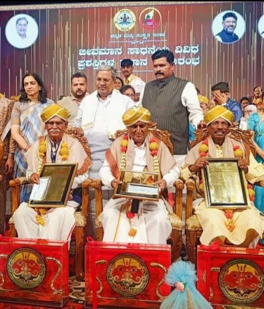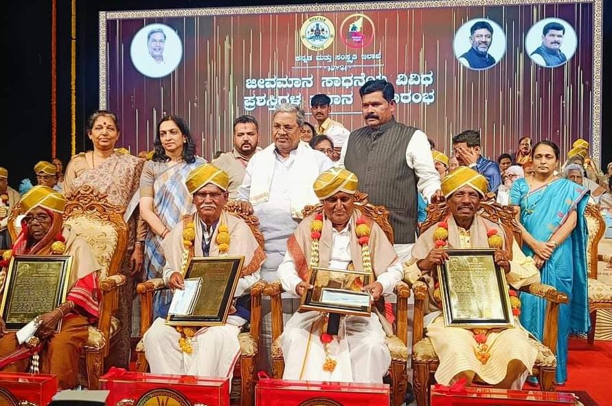 ಬೆಂಗಳೂರಿನಲ್ಲಿ ಜ.31 ಬುಧವಾರ ಸಿಎಂ ಸಿದ್ದರಾಮಯ್ಯ ಮತ್ತು ಕನ್ನಡ ಮತ್ತು ಸಂಸ್ಕೃತಿ ಇಲಾಖೆ ಸಚಿವ ಶಿವರಾಜ ತಂಗಡಗಿಯವರು ‘ಜಾನಪದ ಶ್ರೀ’ ಪ್ರಶಸ್ತಿ ಪುತ್ಥಳಿ, ಫಲಕ, ಶಾಲು, ಹಾರ ಹಾಗೂ ರೂ.5.೦೦ ಲಕ್ಷಗಳ ನಗದನ್ನು ಮಾರೆಪ್ಪ ಮಾರೆಪ್ಪ ಚನ್ನದಾಸರ ಅವರಿಗೆ ನೀಡಿ ಗೌರವಿಸಿದ್ದಾರೆ.