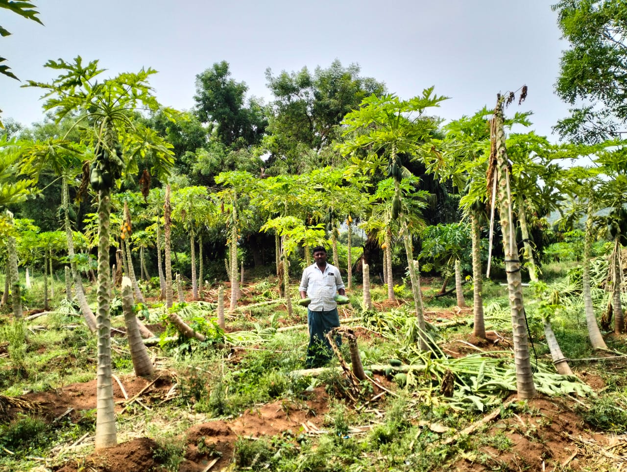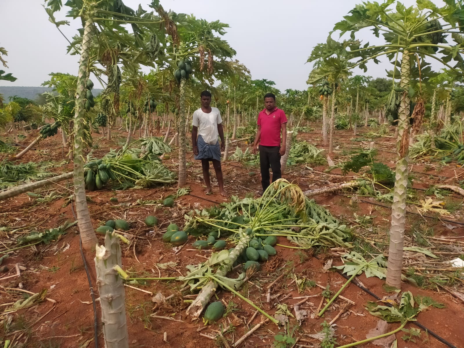 ರೈತ ಸಿದ್ದಪ್ಪ ವ್ಯಾಪಾರಿ ಎಂಬುವರಿಗೆ ಸೇರಿದ ತೋಟದಲ್ಲಿ ಸುಮಾರು 600 ಗಿಡಗಳು, ರಂಗಪ್ಪ ಮೆಣಸಿಗೇರಿ ಎಂಬ ರೈತನಿಗೆ ಸೇರಿದ ತೋಟದಲ್ಲಿ ಅಂದಾಜು 500ಕ್ಕೂ ಹೆಚ್ಚು ಗಿಡಗಳು ಹಾಳಾಗಿವೆ. ಈ ಮೂರು ತೋಟಗಳಲ್ಲಿ ಸುಮಾರು 2100 ಪಪ್ಪಾಯಿ ಗಿಡಗಳು ನಾಶವಾಗಿದ್ದು, ಗಿಡಗಳಲ್ಲಿನ ಎಲ್ಲ ಎಲೆಗಳು ಹರಿದು, ಕಾಯಿಗಳು ನೆಲಕ್ಕೆ ಬಿದ್ದ ಪರಿಣಾಮ ರೈತರು ತಲೆ ಮೇಲೆ ಕೈಹೊತ್ತು ಕುಳಿತಿದ್ದಾರೆ.