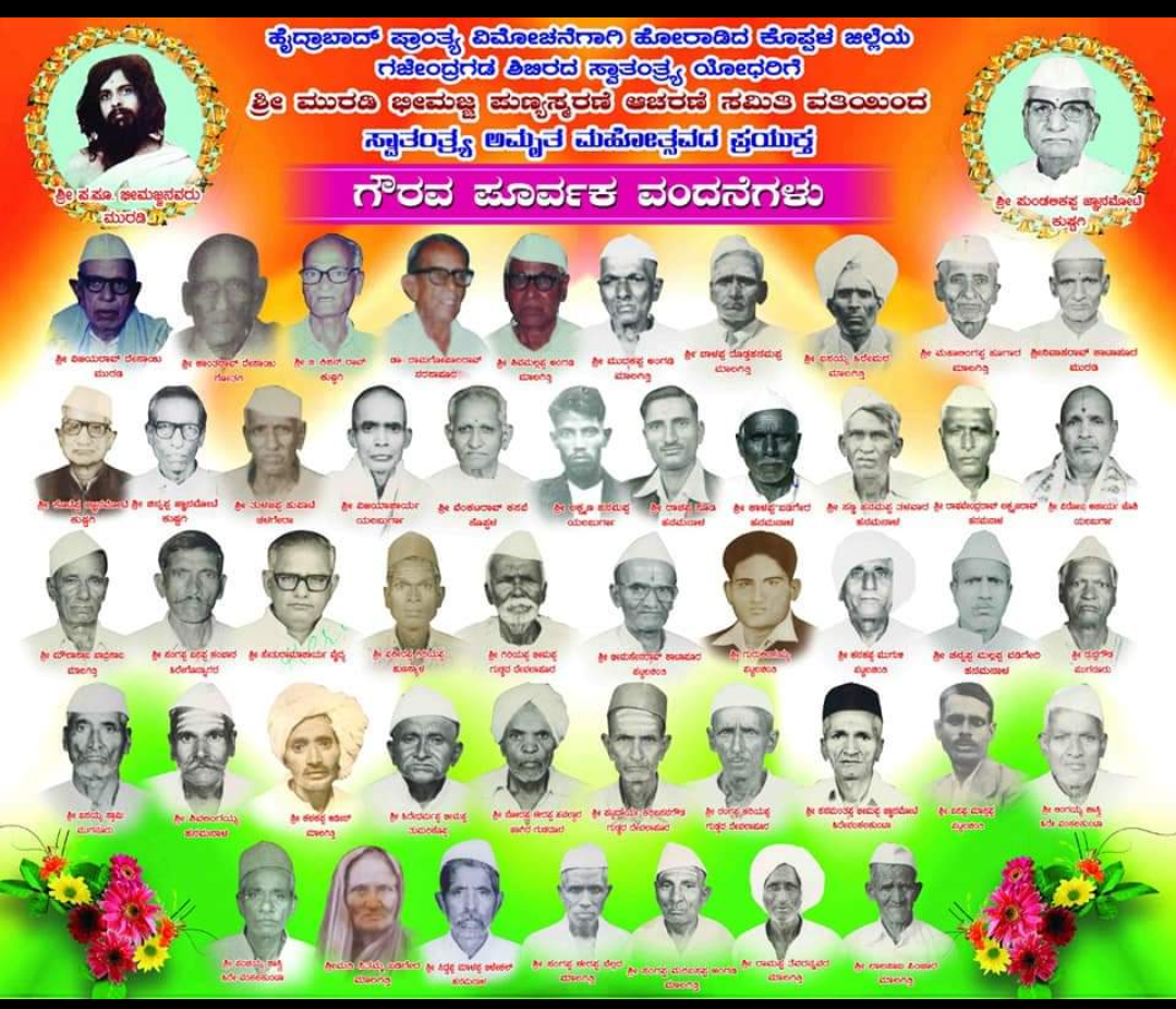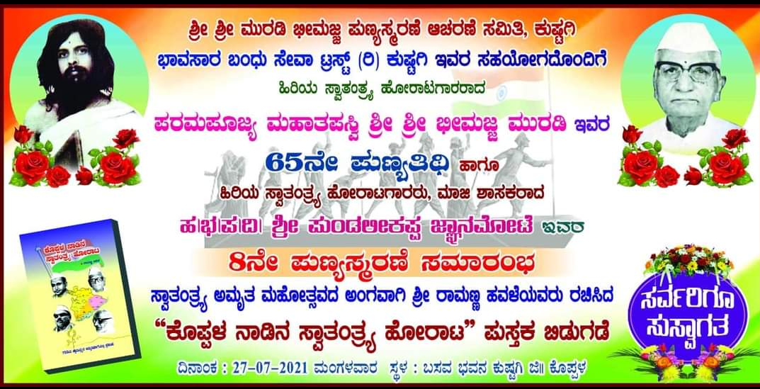 ಕೊಪ್ಪಳ : ಜಿಲ್ಲೆಯ ಕುಷ್ಟಗಿ ಪಟ್ಟಣದ ಬಸವ ಭವನದಲ್ಲಿ ಜು.27ರಂದು ಬೆಳಿಗ್ಗೆ 10ಕ್ಕೆ ಸ್ವಾತಂತ್ರ್ಯ ಸೇನಾನಿ, ತಪಸ್ವಿ ಮುರಡಿ ಭೀಮಜ್ಜನವರ 65ನೇ ಪುಣ್ಯತಿಥಿ ಹಾಗೂ ಹಿರಿಯ ಸ್ವಾತಂತ್ರ್ಯ ಹೋರಾಟಗಾರ, ಮಾಜಿ ಶಾಸಕ ಪುಂಡಲೀಕಪ್ಪ 8ನೇ ಪುಣ್ಯಸ್ಮರಣೆ ಕಾರ್ಯಕ್ರಮ ನಡೆಯಲಿದೆ..!