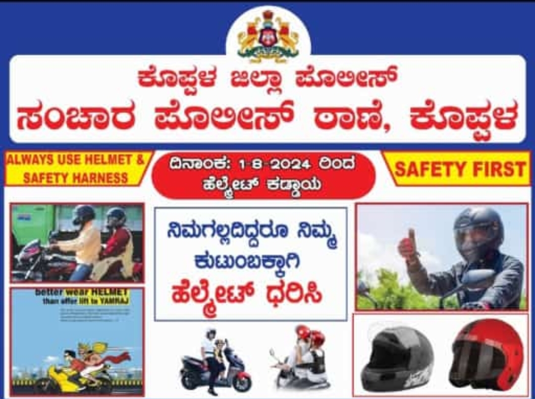ಕೊಪ್ಪಳ : ಅಪಘಾತಗಳಿಂದಾಗುವ ಅನಾಹುತ ತಪ್ಪಿಸಲು ಪೊಲೀಸ್ ಇಲಾಖೆ ಜಿಲ್ಲೆಯಾದ್ಯಂತ ಆಗಸ್ಟ್ 01 ರಿಂದ ಬೈಕ್ ಸವಾರರಿಗೆ ಕಡ್ಡಾಯವಾಗಿ ಹೆಲ್ಮೆಟ್ ಧರಿಸಿ ಪ್ರಯಾಣಿಸಲು ತಿಳಿಸಿದೆ.