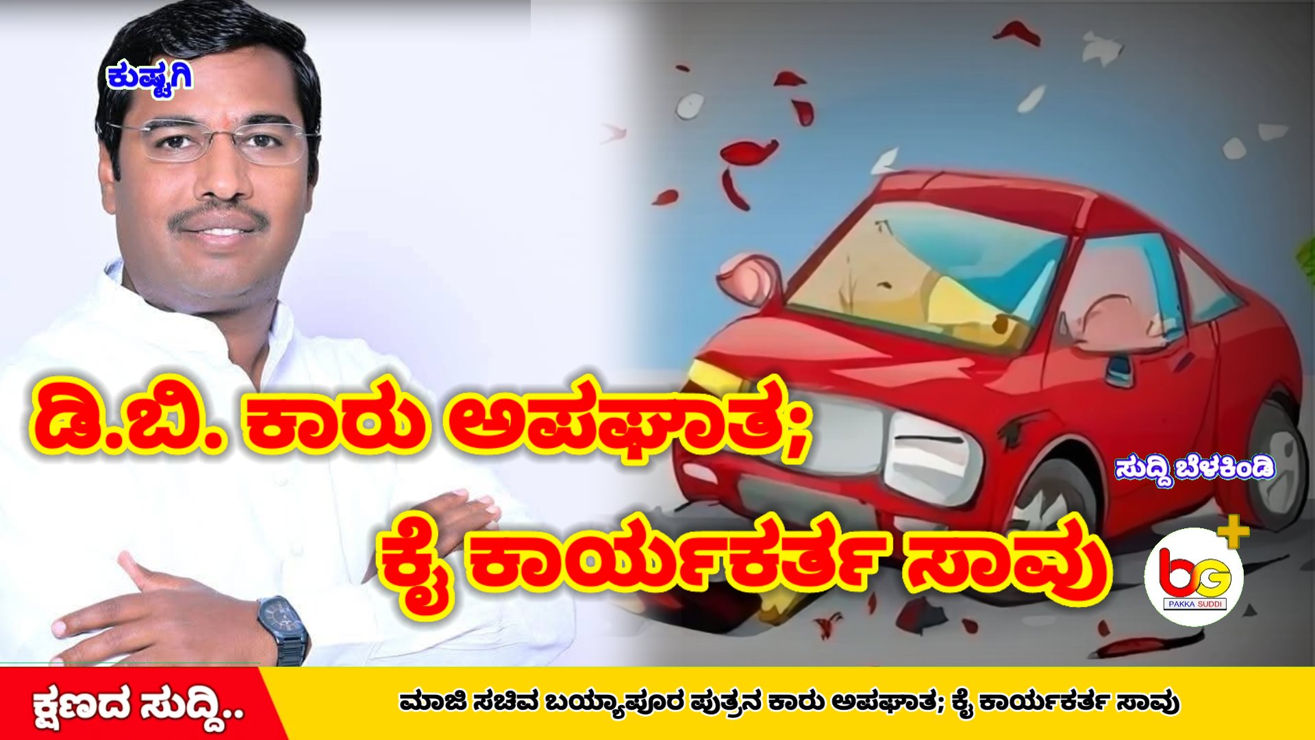 ಕುಷ್ಟಗಿ: ಮಾಜಿ ಸಚಿವ ಅಮರೇಗೌಡ ಪಾಟೀಲ್ ಬಯ್ಯಾಪೂರ ಅವರ ಪುತ್ರ ದೊಡ್ಡಬಸವ ಬಯ್ಯಾಪೂರ ಅವರು ಪ್ರಯಾಣಿಸುತ್ತಿದ್ದ ಕಾರು ಶುಕ್ರವಾರ ಅಪಘಾತಕ್ಕೀಡಾಗಿದೆ. ಅವರೊಂದಿಗಿದ್ದ ಪಟ್ಟಣದ ಕಾಂಗ್ರೆಸ್ ಕಾರ್ಯಕರ್ತರೊಬ್ಬರು ಸಾವಿಗೀಡಾಗಿದ್ದಾರೆ.
