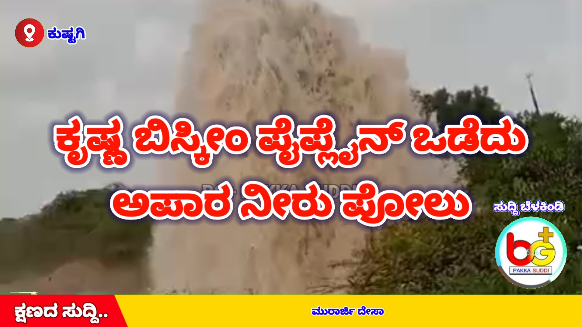 ಕುಷ್ಟಗಿ : ಕೃಷ್ಣಾ ಬಿಸ್ಕೀಂನ ಕೆರೆ ತುಂಬಿಸೋ ಯೋಜನೆಯಡಿ ಅಳವಡಿಸಿರುವ ಮುಖ್ಯ ಪೈಪ್ಲೈನ್ ಭಾನುವಾರ ಒಡೆದು ಅಪಾರ ಪ್ರಮಾಣದ ನೀರು ಪೋಲಾಗುತ್ತಿದೆ.